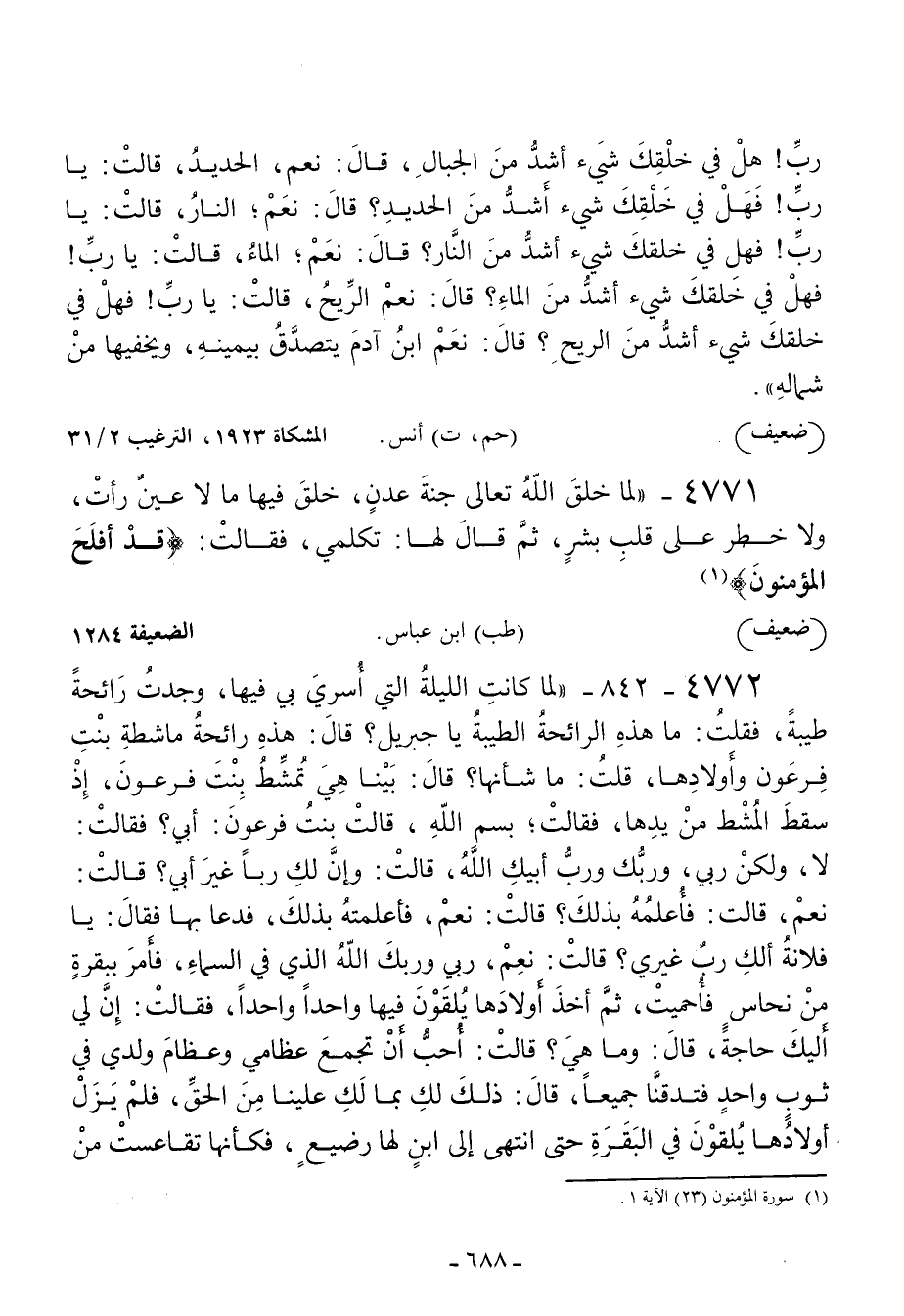 4771 - لما خلق الله تعالى جنة عدن خلق فيها ما لا عين رأت ولا خطر على قلب بشر ثم قال لها: تكلمي فقالت: {قد أفلح المؤمنون}