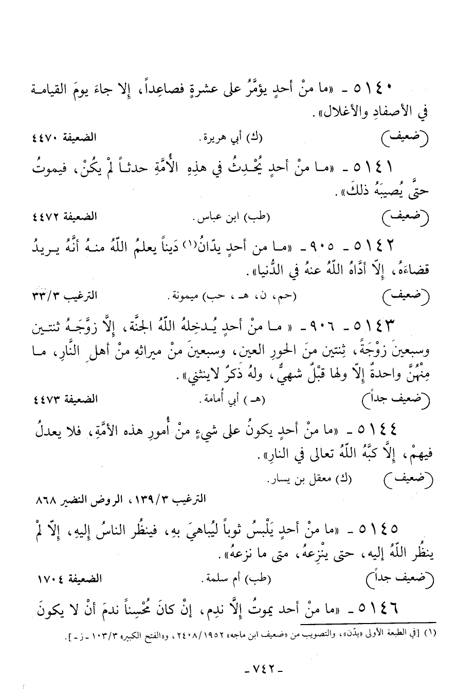 5143 - ما من أحد يدخله الله الجنة إلا زوجه ثنتين وسبعين زوجة ثنتين من الحور العين وسبعين من ميراثه من أهل النار ما منهن واحدة إلا ولها قبل شهي وله ذكر لا ينثني
