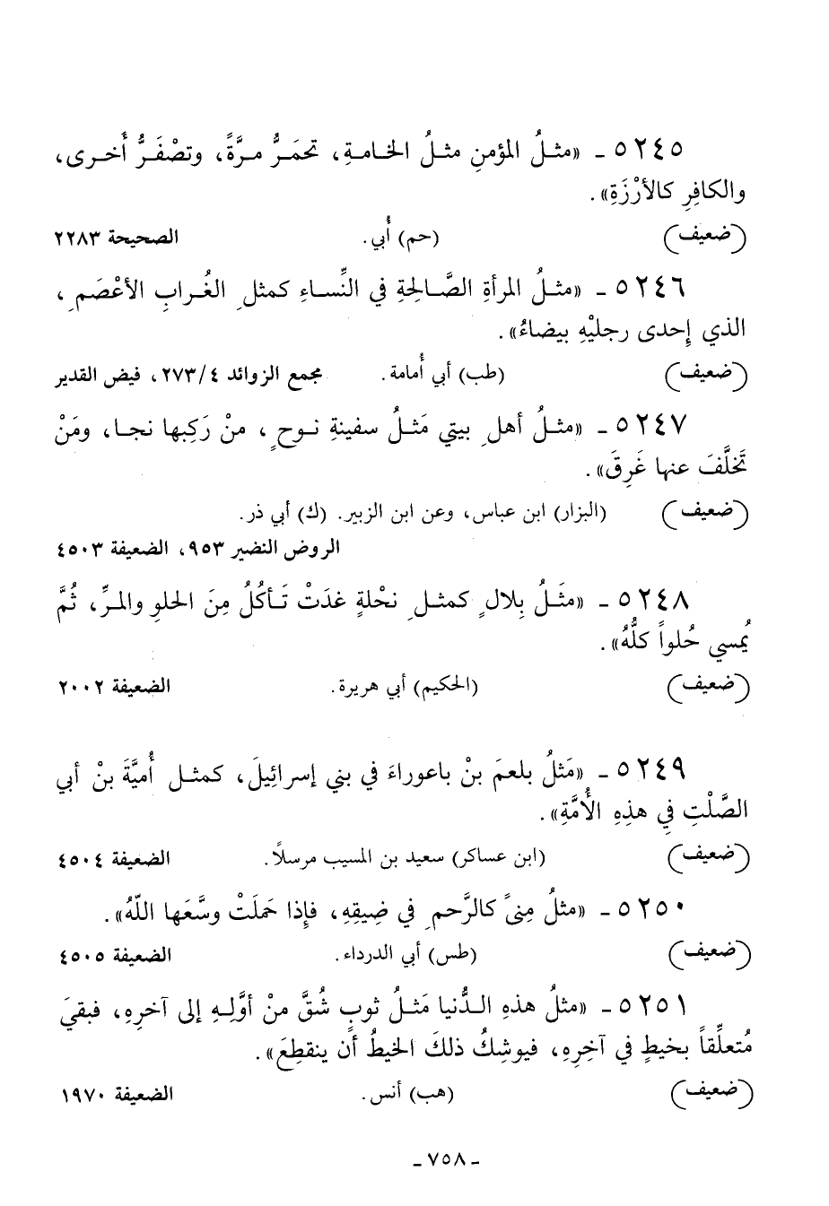 5246 - مثل المرأة الصالحة في النساء كمثل الغراب الأعصم الذي إحدى رجليه بيضاء