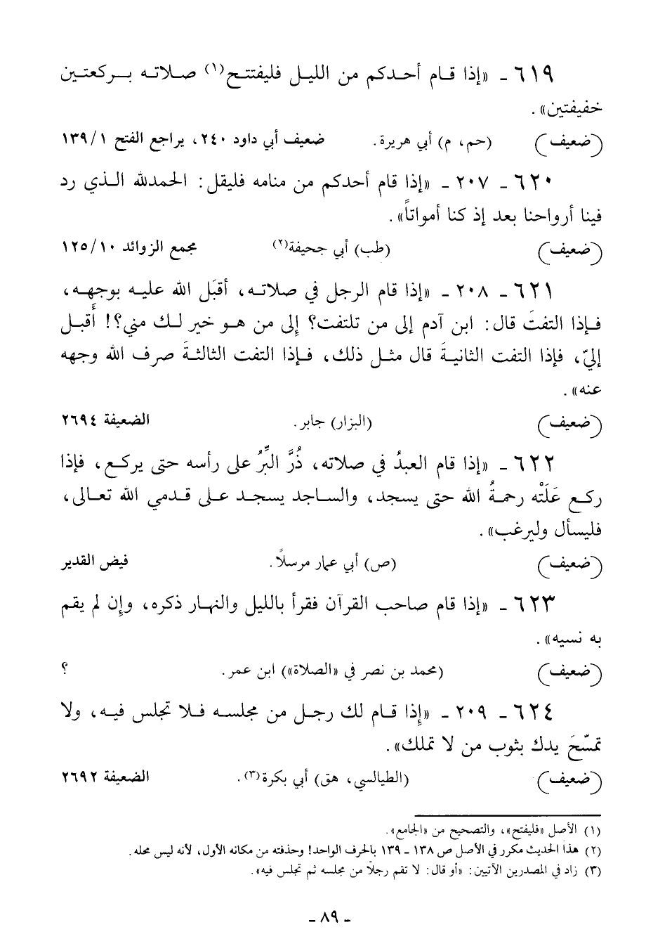 621 - إذا قام الرجل في صلاته أقبل الله عليه بوجهه فإذا التفت قال: ابن آدم إلى من تلتفت؟ إلى من هو خير لك مني؟ ! أقبل إلي فإذا التفت الثانية قال مثل ذلك فإذا التفت الثالثة صرف الله وجهه عنه