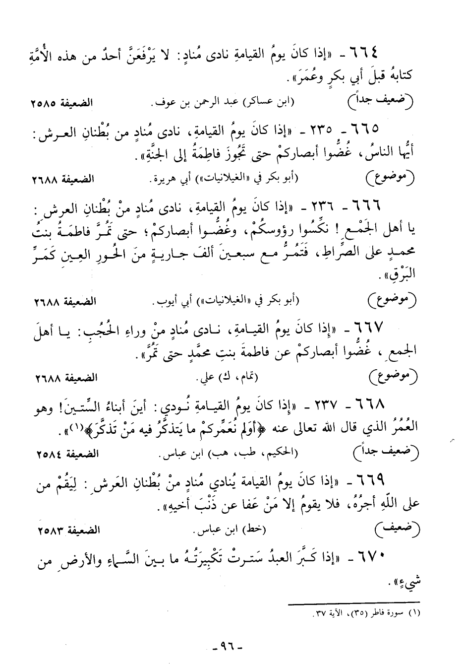 666 - إذا كان يوم القيامة نادى مناد من بطنان العرش: يا أهل الجمع! نكسوا رءوسكم وغضوا أبصاركم حتى تمر فاطمة بنت محمد على الصراط فتمر مع سبعين ألف جارية من الحور العين كمر البرق