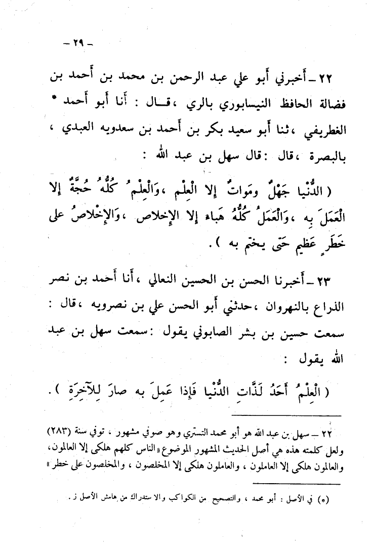 22 - أَخْبَرَنِي أَبُو عَلِيٍّ عَبْدُ الرَّحْمَنِ بْنُ مُحَمَّدِ بْنِ أَحْمَدَ بْنِ فَضَالَةَ الْحَافِظُ النَّيْسَابُورِيُّ، بِالرِّيِّ قَالَ: أَنَا أَبُو أَحْمَدَ الْغِطْرِيفِيُّ، ثنا أَبُو سَعِيدٍ بَكْرُ بْنُ أَحْمَدَ بْنِ سَعْدَوَيْهِ الْعَبْدِيُّ بِالْبَصْرَةِ قَالَ: قَالَ سَهْلُ بْنُ عَبْدِ اللَّهِ: «§الدُّنْيَا جَهْلٌ وَمَوَاتٌ إِلَّا الْعِلْمَ، وَالْعِلْمُ كُلُّهُ حُجَّةٌ إِلَّا الْعَمَلَ بِهِ، وَالْعَمَلُ كُلُّهُ هَبَاءٌ إِلَّا الْإِخْلَاصَ، وَالْإِخْلَاصُ عَلَى خَطَرٍ عَظِيمٍ حَتَّى يُخْتَمَ بِهِ»