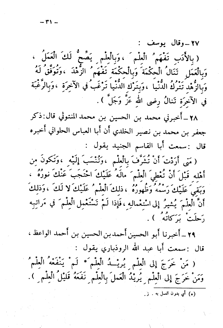 28 - أَخْبَرَنِي مُحَمَّدُ بْنُ الْحُسَيْنِ بْنِ مُحَمَّدٍ الْمَتُّوثِيُّ، قَالَ: ذَكَرَ جَعْفَرُ بْنُ مُحَمَّدِ بْنِ نُصَيْرٍ الْخُلْدِي أَنَّ، أَبَا الْعَبَّاسِ الْحُلْوَانِيَّ أَخْبَرَهُ، قَالَ: سَمِعْتُ أَبَا الْقَاسِمِ الْجُنَيْدَ، يَقُولُ: §«مَتَى أَرَدْتَ أَنْ تُشَرَّفَ بِالْعِلْمِ وَتُنْسَبَ إِلَيْهِ وَتَكُونَ مِنْ أَهْلِهِ قَبْلَ أَنْ تُعْطَى الْعِلْمَ مَا لَهُ عَلَيْكَ، احْتَجَبَ عَنْكَ نُورُهُ وَبَقِيَ عَلَيْكَ رَسْمُهُ وَظُهُورُهُ، ذَلِكَ الْعِلْمُ عَلَيْكَ لَا لَكَ، وَذَلِكَ أَنَّ الْعِلْمَ يُشِيرُ إِلَى اسْتِعْمَالِهِ، فَإِذَا لَمْ تَسْتَعْمِلِ الْعِلْمَ فِي مَرَاتِبِهِ رَحَلَتْ بَرَكَاتُهُ»