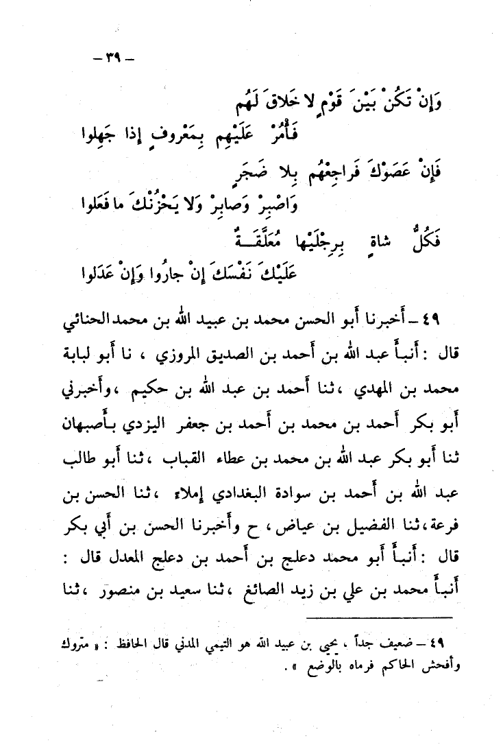 49 - أَخْبَرَنَا أَبُو الْحَسَنِ مُحَمَّدُ بْنُ عَبْدِ اللَّهِ بْنِ مُحَمَّدٍ الْحِنَّائِيُّ قَالَ: أَنْبَأَ عَبْدُ اللَّهِ بْنُ أَحْمَدَ بْنِ الصِّدِّيقِ الْمَرْوَزِيُّ، نا أَبُو لُبَابَةَ مُحَمَّدُ بْنُ الْمَهْدِيِّ، ثنا أَحْمَدُ بْنُ عَبْدِ اللَّهِ بْنِ حَكِيمٍ، وَأَخْبَرَنِي أَبُو بَكْرٍ أَحْمَدُ بْنُ أَحْمَدَ بْنِ جَعْفَرٍ الْيَزْدِيُّ بِأَصْبَهَانَ، ثنا أَبُو بَكْرٍ عَبْدُ اللَّهِ بْنُ مُحَمَّدِ بْنِ عَطَاءٍ الْقَبَّابُ، ثنا أَبُو طَالِبٍ عَبْدُ اللَّهِ بْنُ أَحْمَدَ بْنِ سَوَادَةَ الْبَغْدَادِيُّ، إِمْلَاءً، ثنا الْحَسَنُ بْنُ قَزْعَةَ، ثنا الْفُضَيْلُ بْنُ عِيَاضٍ، ح، وَأَخْبَرَنَا الْحَسَنُ بْنُ أَبِي بَكْرٍ، قَالَ: أَنْبَأَ أَبُو مُحَمَّدٍ دَعْلَجُ بْنُ أَحْمَدَ بْنِ دَعْلَجٍ الْمُعَدِّلُ قَالَ: أَنْبَأَ مُحَمَّدُ بْنُ عَلِيِّ بْنِ زَيْدٍ الصَّائِغُ، ثنا سَعِيدُ بْنُ مَنْصُورٍ، ثنا -[40]- فُضَيْلُ بْنُ عِيَاضٍ، عَنْ يَحْيَى بْنِ عَبْدِ اللَّهِ، عَنْ أَبِيهِ، عَنْ أَبِي هُرَيْرَةَ، قَالَ: قَالَ رَسُولُ اللَّهِ صَلَّى اللهُ عَلَيْهِ وَسَلَّمَ: " أَيَّتُهَا الْأُمَّةُ وَفِي حَدِيثِ الْيَزْدِيِّ: «يَا أَيَّتُهَا الْأُمَّةُ» §إِنِّي لَا أَخَافُ عَلَيْكُمْ فِيمَا لَا تَعْلَمُونَ، وَلَكِنِ انْظُرُوا كَيْفَ تَعْمَلُونَ فِيمَا تَعْلَمُونَ "