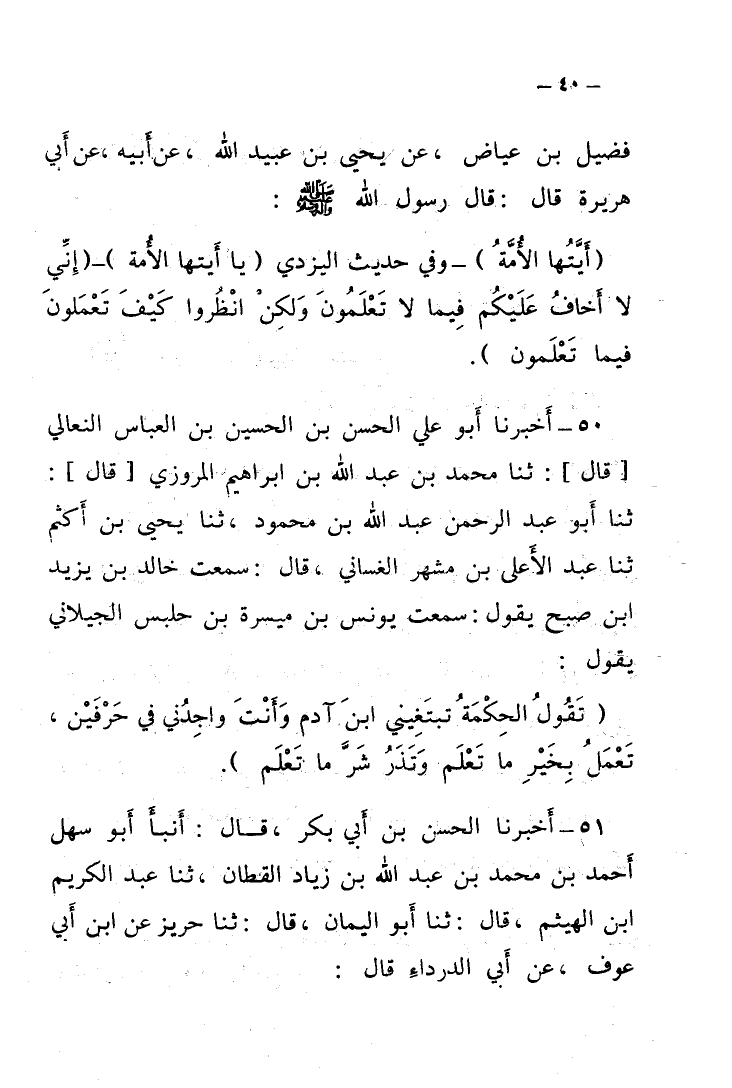 51 - أَخْبَرَنَا الْحَسَنُ بْنُ أَبِي بَكْرٍ، قَالَ: أَنْبَأَ أَبُو سَهْلٍ أَحْمَدُ بْنُ مُحَمَّدِ بْنِ عَبْدِ اللَّهِ بْنِ زِيَادٍ الْقَطَّانُ، ثنا عَبْدُ الْكَرِيمِ بْنُ الْهَيْثَمِ، قَالَ: ثنا أَبُو الْيَمَانِ، قَالَ: ثنا حَرِيزٌ، عَنِ ابْنِ أَبِي عَوْفٍ، عَنْ أَبِي الدَّرْدَاءِ، قَالَ -[41]-: " §إِنَّ الْعَبْدَ يَوْمَ الْقِيَامَةِ لَمَسْؤُولٌ: مَا عَمِلْتَ بِمَا عَلِمْتَ "