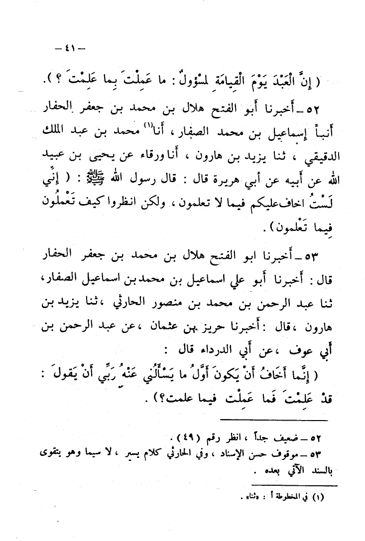 53 - أَخْبَرَنَا أَبُو الْفَتْحِ هِلَالُ بْنُ مُحَمَّدِ بْنِ جَعْفَرٍ الْحَفَّارُ، قَالَ: أَخْبَرَنَا أَبُو عَلِيٍّ إِسْمَاعِيلُ بْنُ مُحَمَّدِ بْنِ إِسْمَاعِيلَ الصَّفَّارُ، ثنا عَبْدُ الرَّحْمَنِ بْنُ مُحَمَّدِ بْنِ مَنْصُورٍ الْحَارِثِيُّ، ثنا يَزِيدُ بْنُ هَارُونَ، قَالَ: أَخْبَرَنَا أَبُو الْفَتْحِ هِلَالُ بْنُ مُحَمَّدِ بْنِ جَعْفَرٍ، أَخْبَرَنَا حَرِيزُ بْنُ عُثْمَانَ، عَنْ عَبْدِ الرَّحْمَنِ بْنِ أَبِي عَوْفٍ، عَنْ أَبِي الدَّرْدَاءِ، قَالَ: " §إِنَّمَا أَخَافُ أَنْ يَكُونَ، أَوَّلَ مَا يَسْأَلُنِي عَنْهُ رَبِّي أَنْ يَقُولَ: قَدْ عَلِمْتَ فَمَا عَمِلْتَ فِيمَا عَلِمْتَ "