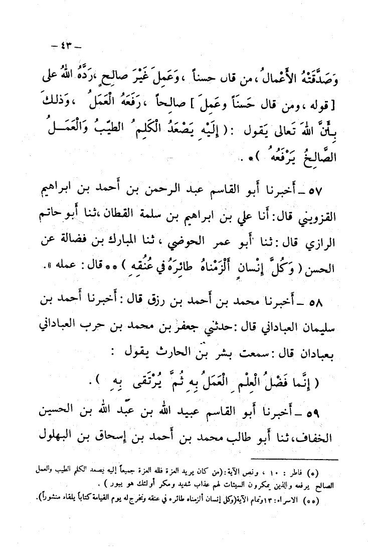 58 - أَخْبَرَنَا مُحَمَّدُ بْنُ أَحْمَدَ بْنِ رِزْقٍ، قَالَ: أَخْبَرَنَا أَحْمَدُ بْنُ سُلَيْمَانَ الْعَبَّادَانِيُّ، قَالَ: حَدَّثَنِي جَعْفَرُ بْنُ مُحَمَّدِ بْنِ حَرْبٍ الْعَبَّادَانِيُّ، بِعَبَادَانَ قَالَ: سَمِعْتُ بِشْرَ بْنَ الْحَارِثِ، يَقُولُ: «§إِنَّمَا فَضْلُ الْعِلْمِ الْعَمَلُ بِهِ، ثُمَّ يَرْتَقِي بِهِ»