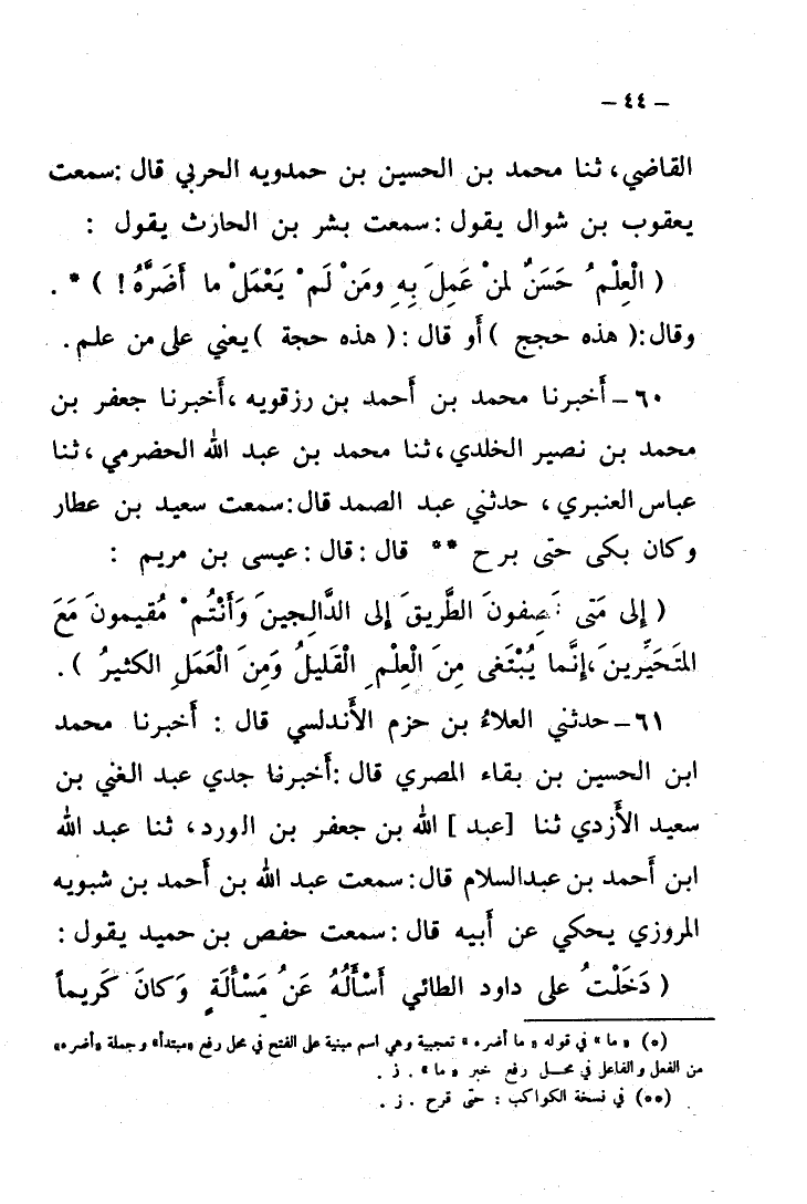 61 - حَدَّثَنِي الْعَلَاءُ بْنُ حَزْمٍ الْأَنْدَلُسِيُّ، قَالَ: أَخْبَرَنَا مُحَمَّدُ بْنُ الْحُسَيْنِ بْنِ بَقَاءٍ الْمِصْرِيُّ، قَالَ: أَخْبَرَنَا جَدِّي عَبْدُ الْغَنِيِّ بْنُ سَعِيدٍ الْأَزْدِيُّ، ثنا عَبْدُ اللَّهِ بْنُ جَعْفَرِ بْنِ الْوَرْدِ، ثنا عَبْدُ اللَّهِ بْنُ أَحْمَدَ بْنِ عَبْدِ السَّلَامِ، قَالَ: سَمِعْتُ عَبْدَ اللَّهِ بْنَ أَحْمَدَ بْنِ شَبُّوَيْهِ الْمَرْوَزِيَّ، يَحْكِي عَنْ أَبِيهِ، قَالَ: سَمِعْتُ حَفْصَ بْنَ حُمَيْدٍ، يَقُولُ: «دَخَلْتُ عَلَى دَاوُدَ الطَّائِيَّ، أَسْأَلُهُ عَنْ مَسْأَلَةٍ وَكَانَ كَرِيمًا -[45]- فَقَالَ» : «§أَرَأَيْتَ الْمُحَارِبَ إِذَا أَرَادَ أَنْ يَلْقَى الْحَرْبَ، أَلَيْسَ يَجْمَعُ آلَتَهُ، فَإِذَا أَفْنَى عُمُرَهُ فِي الْآلَةِ فَمَتَى يُحَارِبُ، إِنَّ الْعِلْمَ آلَةُ الْعَمَلِ، فَإِذَا أَفْنَى عُمُرَهُ فِي جَمْعِهِ فَمَتَى يَعْمَلُ؟»