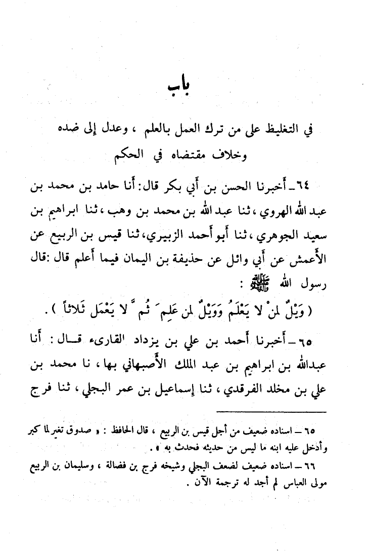 64 - أَخْبَرَنَا الْحَسَنُ بْنُ أَبِي بَكْرٍ، قَالَ: أَنَا حَامِدُ بْنُ مُحَمَّدِ بْنِ عَبْدِ اللَّهِ الْهَرَوِيُّ، ثنا عَبْدُ اللَّهِ بْنُ مُحَمَّدِ بْنِ وَهْبٍ، ثنا إِبْرَاهِيمُ بْنُ سَعِيدٍ الْجَوْهَرِيُّ، ثنا أَبُو أَحْمَدَ الزُّبَيْرِيُّ، ثنا قَيْسُ بْنُ الرَّبِيعِ، عَنِ الْأَعْمَشِ، عَنْ أَبِي وَائِلٍ، عَنْ حُذَيْفَةَ بْنِ الْيَمَانِ، فِيمَا أَعْلَمُ قَالَ: قَالَ رَسُولُ اللَّهِ صَلَّى اللَّهُ عَلَيْهِ وَسَلَّمَ: «§وَيْلٌ لِمَنْ لَا يَعْلَمُ، وَوَيْلٌ لِمَنْ عَلِمَ ثُمَّ لَا يَعْمَلُ ثَلَاثًا»