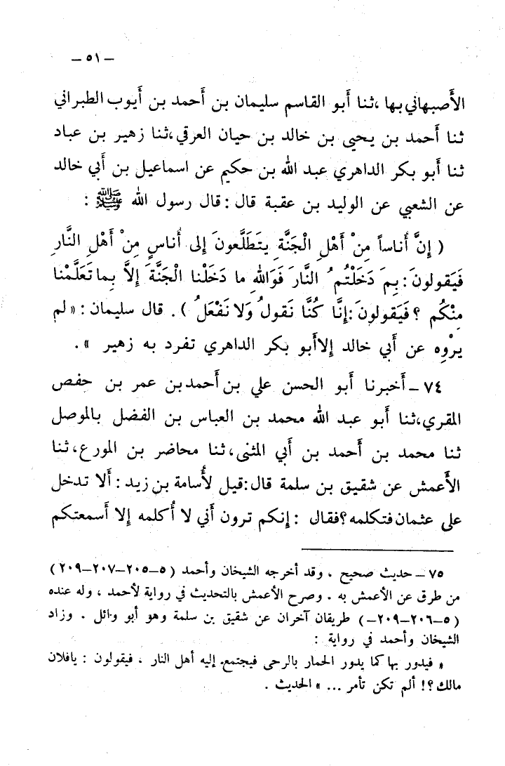 74 - أَخْبَرَنَا أَبُو الْحَسَنِ عَلِيُّ بْنُ أَحْمَدَ بْنِ حَفْصٍ الْمُقْرِيُّ، ثنا أَبُو عَبْدِ اللَّهِ مُحَمَّدُ بْنُ الْعَبَّاسِ بْنِ الْفَضْلِ، بِالْمَوْصِلِ، ثنا مُحَمَّدُ بْنُ أَحْمَدَ بْنِ أَبِي الْمُثَنَّى، ثنا مُحَاضِرُ بْنُ الْمُوَرِّعِ، ثنا الْأَعْمَشُ، عَنْ شَقِيقِ بْنِ سَلَمَةَ، قَالَ: " قِيلَ لِأُسَامَةَ بْنِ زَيْدٍ،: أَلَا تَدْخُلُ عَلَى عُثْمَانَ فَتُكَلِّمَهُ، فَقَالَ: إِنَّكُمْ تَرَوْنَ أَنِّي لَا أُكَلِّمُهُ إِلَّا أَسْمَعْتُكُمْ -[52]-، لَقَدْ كَلَّمْتُهُ فِيمَا بَيْنِي وَبَيْنَهُ دُونَ أَنْ أَفْتَحَ أَمْرًا لَا أَحَبُّ أَنْ أَكُونَ أَوَّلَ مَنْ فَتَحَهُ، وَلَا أَقُولُ لِرَجُلٍ إِنَّكَ خَيْرُ النَّاسِ، وَإِنْ كَانَ عَلَيَّ أَمِيرًا، بَعْدَ أَنْ سَمِعْتُ رَسُولَ اللَّهِ صَلَّى اللهُ عَلَيْهِ وَسَلَّمَ يَقُولُ، قَالَ: وَمَا سَمِعْتُهُ يَقُولُ قَالَ: قَالَ: " §يُؤْتَى بِالرَّجُلِ يَوْمَ الْقِيَامَةِ فَيُلْقَى فِي النَّارِ فَتَنْدَلِقُ أَقْتَابُهُ، فَيُقَالُ أَلَيْسَ كُنْتَ تَأْمُرُ بِالْمَعْرُوفِ وَتَنْهَى عَنِ الْمُنْكَرِ، قَالَ: كُنْتُ آمُرُكُمْ بِالْمَعْرُوفِ وَلَا أَفْعَلُهُ، وَأَنْهَاكُمْ عَنِ الْمُنْكَرِ وَآتِيهِ "