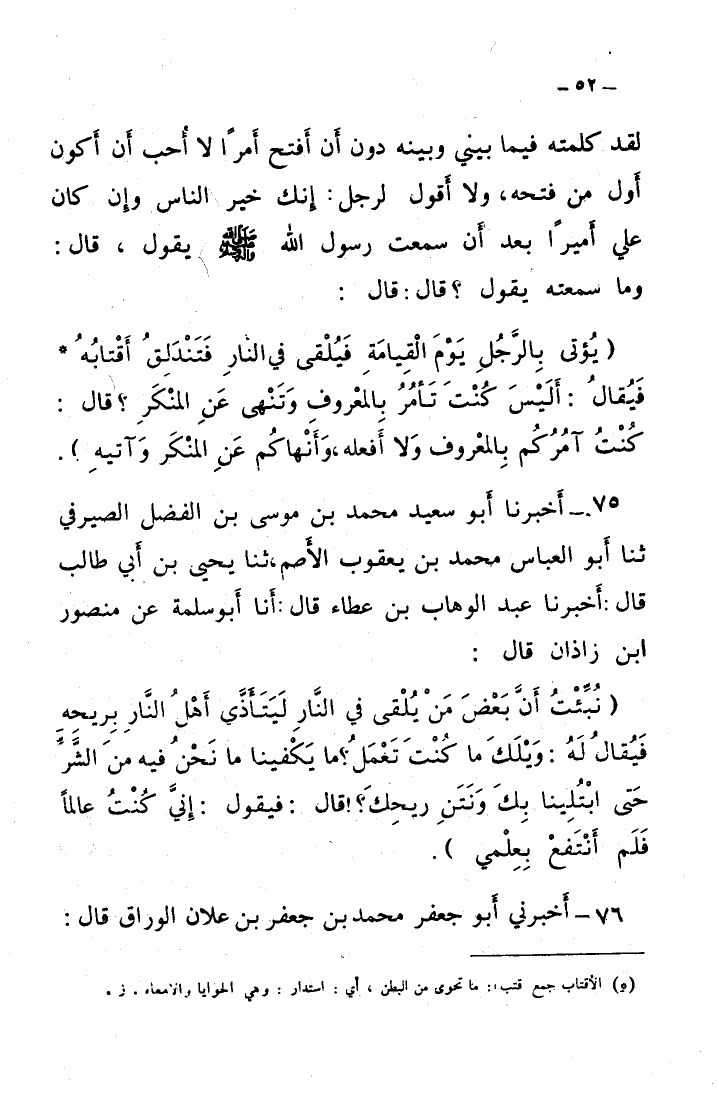 75 - أَخْبَرَنَا أَبُو سَعِيدٍ مُحَمَّدُ بْنُ مُوسَى بْنِ الْفَضْلِ الصَّيْرَفِيُّ، ثنا أَبُو الْعَبَّاسِ مُحَمَّدُ بْنُ يَعْقُوبَ الْأَصَمُّ، ثنا يَحْيَى بْنُ أَبِي طَالِبٍ، قَالَ أَخْبَرَنَا عَبْدُ الْوَهَّابِ بْنُ عَطَاءٍ، قَالَ: أَنَا أَبُو سَلَمَةَ، عَنْ مَنْصُورِ بْنِ زَاذَانَ، قَالَ: نُبِّئْتُ " §أَنَّ بَعْضَ، مَنْ يُلْقَى فِي النَّارِ لَيَتَأَذَّى أَهْلُ النَّارِ بِرِيحِهِ، فَيُقَالُ لَهُ: وَيْلُكَ مَا كُنْتَ تَعْمَلُ؟ مَا يَكْفِينَا مَا نَحْنُ فِيهِ مِنَ الشَّرِّ حَتَّى ابْتُلِينَا بِكَ وَنَتْنِ رِيحِكَ؟ قَالَ: فَيَقُولُ إِنِّي كُنْتُ عَالِمًا فَلَمْ أَنْتَفِعْ بِعِلْمِي "