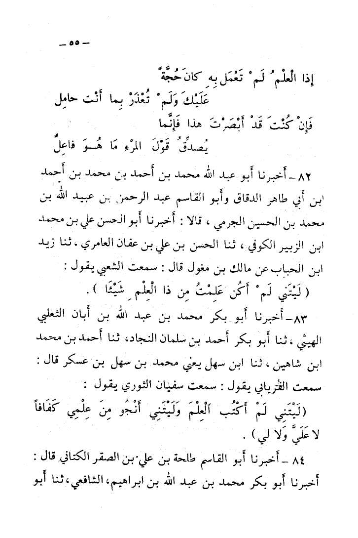 83 - أَخْبَرَنَا أَبُو بَكْرٍ مُحَمَّدُ بْنُ عَبْدِ اللَّهِ بْنِ أَبَانَ الثَّعْلَبِيُّ الْهِيتِي، ثنا أَبُو بَكْرٍ أَحْمَدُ بْنُ سَلْمَانَ النَّجَّادُ، ثنا أَحْمَدُ بْنُ مُحَمَّدِ بْنِ شَاهِينَ، ثنا ابْنُ سَهْلٍ يَعْنِي مُحَمَّدَ بْنَ سَهْلِ بْنِ عَسْكَرٍ، قَالَ سَمِعْتُ الْفِرْيَابِيَّ، يَقُولُ سَمِعْتُ سُفْيَانَ الثَّوْرِيَّ، يَقُولُ: «§لَيْتَنِي لَمْ أَكْتُبِ الْعِلْمَ، وَلَيْتَنِي أَنْجُو مِنْ عِلْمِي كَفَافًا لَا عَلَيَّ وَلَا لِي»