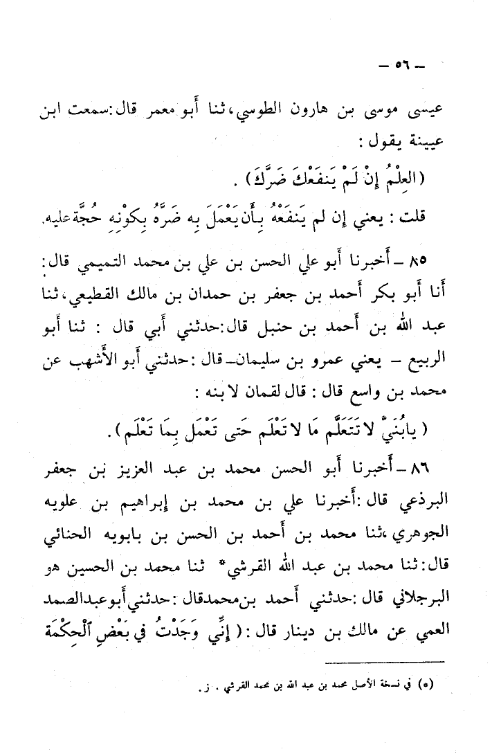 86 - أَخْبَرَنَا أَبُو الْحَسَنِ مُحَمَّدُ بْنُ عَبْدِ الْعَزِيزِ بْنِ جَعْفَرٍ الْبَرْذَعِيُّ، قَالَ: أَخْبَرَنَا عَلِيُّ بْنُ مُحَمَّدِ بْنِ إِبْرَاهِيمَ بْنِ عَلُّوَيْهِ الْجَوْهَرِيُّ، ثنا مُحَمَّدُ بْنُ أَحْمَدَ بْنِ الْحَسَنِ بْنِ بَابَوَيْهِ الْحِنَّائِيُّ، قَالَ: ثنا عَبْدِ اللَّهِ بْنُ مُحَمَّدُ الْقُرَشِيُّ، ثنا مُحَمَّدُ بْنُ الْحُسَيْنِ هُوَ الْبُرْجَلَانِيُّ، قَالَ: حَدَّثَنِي أَحْمَدُ بْنُ مُحَمَّدٍ، قَالَ حَدَّثَنِي أَبُو عَبْدِ الصَّمَدِ الْعَمِّيُّ، عَنْ مَالِكِ بْنِ دِينَارٍ، قَالَ: «إِننِّي وَجَدْتُ فِي بَعْضِ الْحِكْمَةِ» -[57]-: §«لَا خَيْرَ لَكَ أَنْ تَعْلَمَ مَا لَمْ تَعْلَمْ وَلَمْ تَعْمَلْ، بِمَا قَدْ عَلِمْتَ فَإِنَّ مَثَلَ ذَلِكَ مِثْلَ رَجُلٍ احْتَطَبَ حَطَبًا فَحَزَمَ حُزْمَةً، ذَهَبَ يَحْمِلُهَا فَعَجَزَ عَنْهَا، فَضَمَّ إِلَيْهَا أُخْرَى»