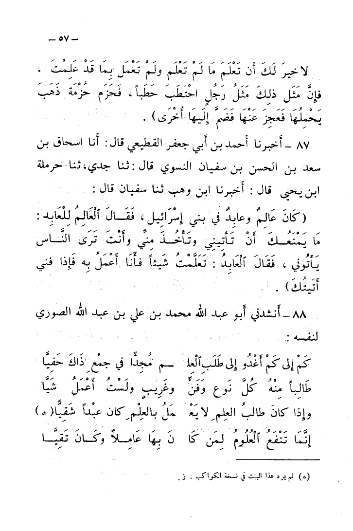 87 - أَخْبَرَنَا أَحْمَدُ بْنُ أَبِي جَعْفَرٍ الْقَطِيعِيُّ، قَالَ: أَنَا إِسْحَاقُ بْنُ سَعْدِ بْنِ الْحَسَنِ بْنِ سُفْيَانَ النَّسَوِيُّ، قَالَ: ثنا جَدِّي، ثنا حَرْمَلَةُ بْنُ يَحْيَى، قَالَ: أَخْبَرَنَا ابْنُ وَهْبٍ، ثنا سُفْيَانُ، قَالَ: " §كَانَ عَالِمٌ وَعَابِدٌ فِي بَنِي إِسْرَائِيلَ، فَقَالَ الْعَالِمُ لِلْعَابِدِ: مَا يَمْنَعُكَ أَنْ تَأْتِيَنِيَ وَتَأْخُذَ مِنِّي وَأَنْتَ تَرَى النَّاسَ يَأْتُونِي؟ فَقَالَ الْعَابِدُ: تَعَلَّمْتُ شَيْئًا فَأَنَا أَعْمَلُ بِهِ فَإِذَا فَنِيَ أَتَيْتُكَ"
