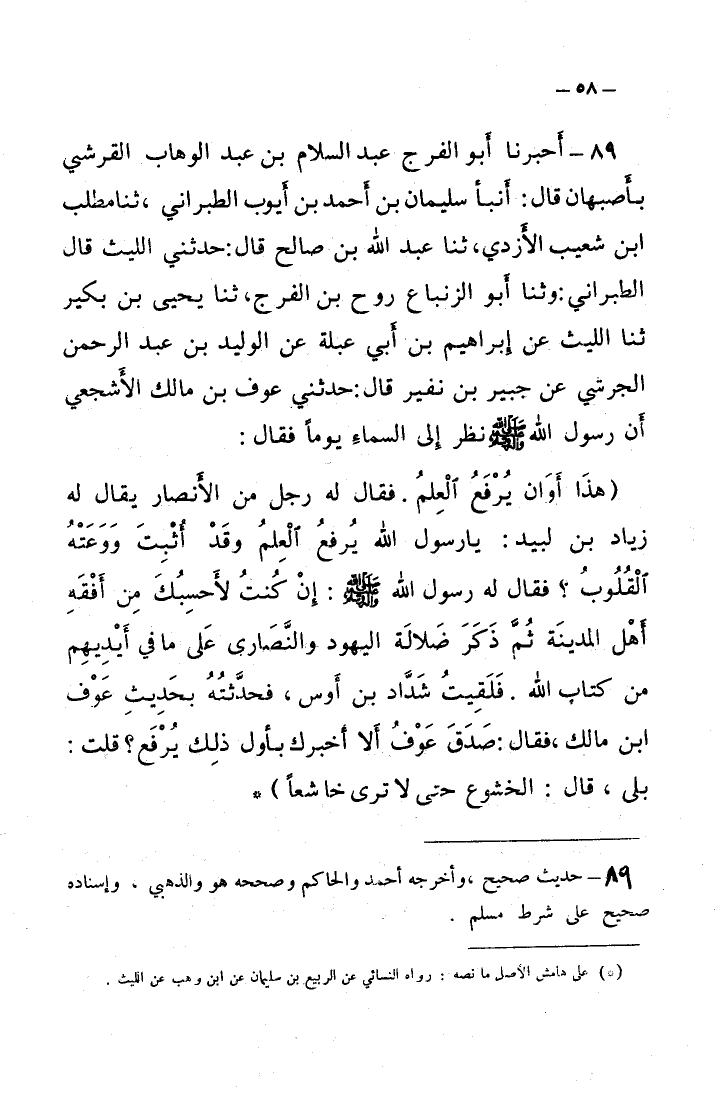 أَخْبَرَنَا أَبُو الْفَرَجِ عَبْدُ السَّلَامِ بْنُ عَبْدِ الْوَهَّابِ الْقُرَشِيُّ، بِأَصْبَهَانَ، قَالَ: أَنْبَأَ سُلَيْمَانُ بْنُ أَحْمَدَ بْنِ أَيُّوبَ الطَّبَرَانِيُّ، ثنا مُطَّلِبُ بْنُ شُعَيْبٍ الْأَزْدِيُّ، ثنا عَبْدُ اللَّهِ بْنُ صَالِحٍ، قَالَ: حَدَّثَنِي اللَّيْثُ، قَالَ: الطَّبَرَانِيُّ وَثنا أَبُو الزِنْبَاعِ رَوْحُ بْنُ الْفَرَجِ، ثنا يَحْيَى بْنُ بُكَيْرٍ، ثنا اللَّيْثُ، عَنْ إِبْرَاهِيمَ بْنِ أَبِي عَبْلَةَ، عَنِ الْوَلِيدِ بْنِ عَبْدِ الرَّحْمَنِ الْجُرَشِيِّ، عَنْ جُبَيْرِ بْنِ نُفَيْرٍ، قَالَ: حَدَّثَنِي عَوْفُ بْنُ مَالِكٍ الْأَشْجَعِيُّ، أَنَّ رَسُولَ اللَّهِ صَلَّى اللهُ عَلَيْهِ وَسَلَّمَ نَظَرَ إِلَى السَّمَاءِ يَوْمًا فَقَالَ: §«هَذَا أَوَانُ رَفْعِ الْعِلْمِ» فَقَالَ لَهُ رَجُلٌ مِنَ الْأَنْصَارِ يُقَالُ لَهُ زِيَادُ بْنُ لَبِيدٍ: يَا رَسُولَ اللَّهِ يُرْفَعُ الْعِلْمُ وَقَدْ أُثْبِتَ وَوَعَتْهُ الْقُلُوبُ؟ فَقَالَ لَهُ رَسُولُ اللَّهِ صَلَّى اللهُ عَلَيْهِ وَسَلَّمَ: «إِنْ كُنْتُ لَأَحْسَبُكَ مِنْ أَفْقَهِ أَهْلِ الْمَدِينَةِ» ، ثُمَّ ذَكَرَ ضَلَالَةَ الْيَهُودِ وَالنَّصَارَى عَلَى مَا فِي أَيْدِيهِمْ مِنْ كِتَابِ اللَّهِ، فَلَقِيتُ شَدَّادَ بْنَ أَوْسٍ فَحَدَّثْتُهُ بِحَدِيثِ عَوْفِ بْنِ مَالِكٍ، فَقَالَ: صَدَقَ عَوْفٌ أَلَا أُخْبِرُكَ بِأَوَّلِ ذَلِكَ يُرْفَعُ؟ قُلْتُ: بَلَى، قَالَ: الْخُشُوعُ، لَا تَرَى خَاشِعًا "