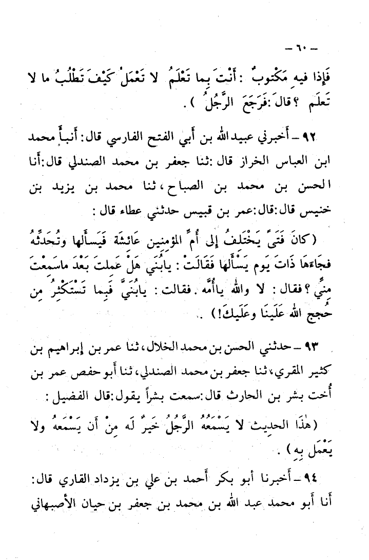 92 - أَخْبَرَنِي عُبَيْدُ اللَّهِ بْنُ أَبِي الْفَتْحِ الْفَارِسِيُّ، قَالَ أَنْبَأَ مُحَمَّدُ بْنُ الْعَبَّاسِ الْخَزَّازُ، قَالَ ثنا جَعْفَرُ بْنُ مُحَمَّدٍ الصَّنْدَلِيُّ، قَالَ: أَنَا الْحَسَنُ بْنُ مُحَمَّدِ بْنِ الصَّبَّاحِ، ثنا مُحَمَّدُ بْنُ يَزِيدَ بْنِ خُنَيْسٍ، قَالَ: قَالَ عُمَرُ بْنُ قُبَيْسٍ،: حَدَّثَنِي عَطَاءٌ، قَالَ: " كَانَ فَتًى يَخْتَلِفُ إِلَى أُمِّ الْمُؤْمِنِينَ عَائِشَةَ، فَيَسْأَلُهَا وَتُحَدِّثُهُ، فَجَاءَهَا ذَاتَ يَوْمٍ يَسْأَلُهَا فَقَالَتْ: يَا بُنَيَّ §هَلْ عَمِلْتَ بَعْدَ بِمَا سَمِعْتَ مِنِّي؟ فَقَالَ: لَا وَاللَّهِ يَا أُمُّهْ، فَقَالَتْ: يَا بُنَيَّ فَبِمَا تَسْتَكْثِرُ مِنْ حُجَجِ اللَّهِ عَلَيْنَا وَعَلَيْكَ "