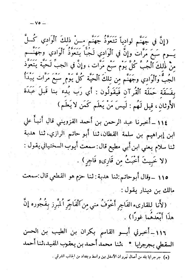 114 - أَخْبَرَنَا عَبْدُ الرَّحْمَنِ بْنُ أَحْمَدَ الْقَزْوِينِيُّ، قَالَ: أَنْبَأَ عَلِيُّ بْنُ إِبْرَاهِيمَ بْنِ سَلَمَةَ الْقَطَّانُ، ثنا أَبُو حَاتِمٍ الرَّازِيُّ، ثنا هُدْبَةُ، ثنا سَلَّامٌ يَعْنِي ابْنَ أَبِي مُطِيعٍ، قَالَ: سَمِعْتُ أَيُّوبَ السَّخْتِيَانِيَّ، يَقُولُ: §«لَا خَبِيثَ أَخْبَثُ مِنْ قَارِئٍ فَاجِرٍ»