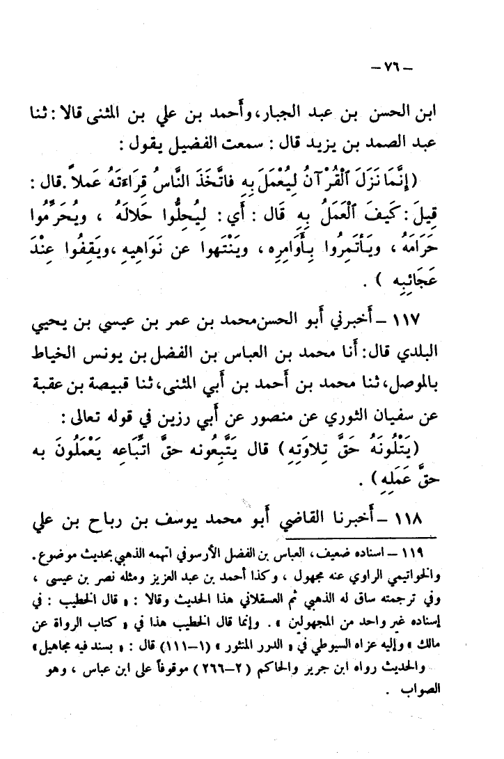 117 - أَخْبَرَنِي أَبُو الْحَسَنِ مُحَمَّدُ بْنُ عُمَرَ بْنِ عِيسَى بْنِ يَحْيَى الْبَلَدِيُّ، قَالَ: أَنَا مُحَمَّدُ بْنُ الْعَبَّاسِ بْنِ الْفَضْلِ بْنِ يُونُسَ الْخَيَّاطُ، بِالْمَوْصِلِ، نا مُحَمَّدُ بْنُ أَحْمَدَ بْنِ أَبِي الْمُثَنَّى، نا قَبِيصَةُ بْنُ عُقْبَةَ، عَنْ سُفْيَانَ الثَّوْرِيِّ، عَنْ مَنْصُورٍ، عَنْ أَبِي رَزِينٍ، فِي قَوْلِهِ تَعَالَى " {§يَتْلُونَهُ حَقَّ تِلَاوَتِهِ} [البقرة: 121] «قَالَ» يَتَّبِعُونَهُ حَقَّ اتِّبَاعِهِ، يَعْمَلُونَ بِهِ حَقَّ عَمَلِهِ "
