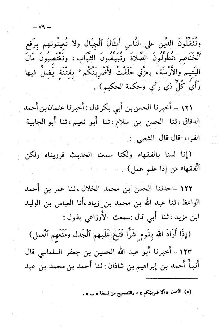 121 - أَخْبَرَنَا الْحَسَنُ بْنُ أَبِي بَكْرٍ، قَالَ: أَخْبَرَنَا عُثْمَانُ بْنُ أَحْمَدَ الدَّقَّاقُ، نا الْحَسَنُ بْنُ سَلَّامٍ، نا أَبُو نُعَيْمٍ، نا أَبُو الْجَابِيَةِ الْفَرَّاءُ، قَالَ: قَالَ الشَّعْبِيُّ،: «§إِنَّا لَسْنَا بِالْفُقَهَاءِ، وَلَكِنَّا سَمِعْنَا الْحَدِيثَ فَرَوَيْنَاهُ، وَلَكِنَّ الْفُقَهَاءَ مَنْ إِذَا عَلِمَ عَمِلَ»