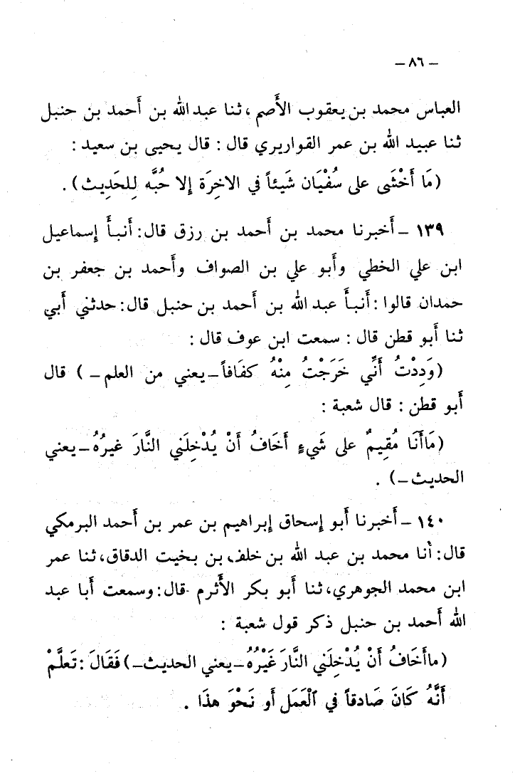 139 - أَخْبَرَنَا مُحَمَّدُ بْنُ أَحْمَدَ بْنِ رِزْقٍ، قَالَ: أَنْبَأَ إِسْمَاعِيلُ بْنُ عَلِيٍّ الْخُطَبِيُّ، وَأَبُو عَلِيِّ بْنُ الصَّوَّافِ، وَأَحْمَدُ بْنُ جَعْفَرِ بْنِ حَمْدَانَ، قَالُوا: أَنا عَبْدُ اللَّهِ بْنُ أَحْمَدَ بْنِ حَنْبَلٍ، قَالَ: حَدَّثَنِي أَبِي، نا أَبُو قَطَنٍ، قَالَ: سَمِعْتُ ابْنَ عَوْنٍ، قَالَ: §«وَدِدَتْ أَنِّي خَرَجْتُ مِنْهُ كَفَافًا، يَعْنِي مِنَ الْعِلْمِ»
