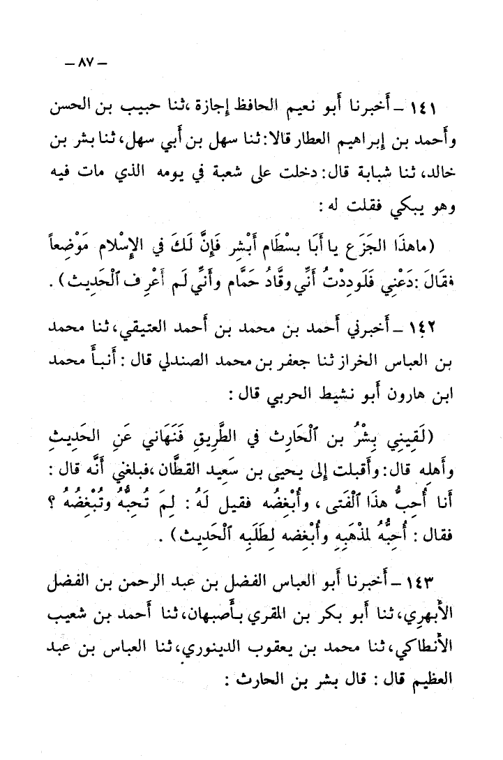 143 - أَخْبَرَنَا أَبُو الْعَبَّاسِ الْفَضْلُ بْنُ عَبْدِ الرَّحْمَنِ بْنِ الْفَضْلِ الْأَبْهَرِيُّ، ثنا أَبُو بَكْرِ بْنُ الْمُقْرِيُّ، بِأَصْبَهَانَ، ثنا أَحْمَدُ بْنُ شُعَيْبٍ الْأَنْطَاكِيُّ، ثنا مُحَمَّدُ بْنُ يَعْقُوبَ الدَّيْنَوَرِيُّ، ثنا الْعَبَّاسُ بْنُ عَبْدِ الْعَظِيمِ، قَالَ: قَالَ بِشْرُ بْنُ الْحَارِثِ،: «§إِنْ أَرَدْتَ أَنْ تَنْتَفِعَ بِالْحَدِيثِ، فَلَا تَسْتَكْثِرْ مِنْهُ، وَلَا تُجَالِسْ أَصْحَابَ الْحَدِيثِ»