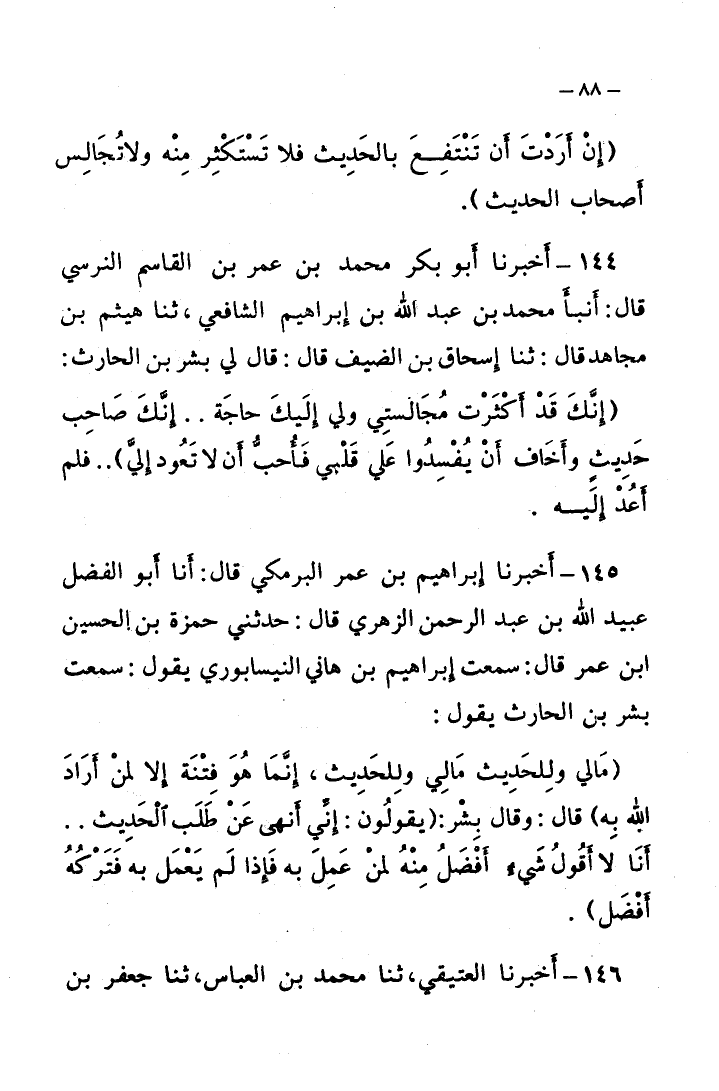 145 - أَخْبَرَنَا إِبْرَاهِيمُ بْنُ عُمَرَ الْبَرْمَكِيُّ، قَالَ: أَنَا أَبُو الْفَضْلِ عُبَيْدُ اللَّهِ بْنُ عَبْدِ الرَّحْمَنِ الزُّهْرِيُّ، قَالَ: حَدَّثَنِي حَمْزَةُ بْنُ الْحُسَيْنِ بْنِ عُمَرَ، قَالَ: سَمِعْتُ إِبْرَاهِيمَ بْنَ هَانِئٍ النَّيْسَابُورِيَّ، يَقُولُ: سَمِعْتُ بِشْرَ بْنَ الْحَارِثِ، يَقُولُ: «§مَالِي وَلِلْحَدِيثِ، مَالِي وَلِلْحَدِيثِ، إِنَّمَا هُوَ فِتْنَةٌ إِلَّا لِمَنْ أَرَادَ اللَّهُ بِهِ»