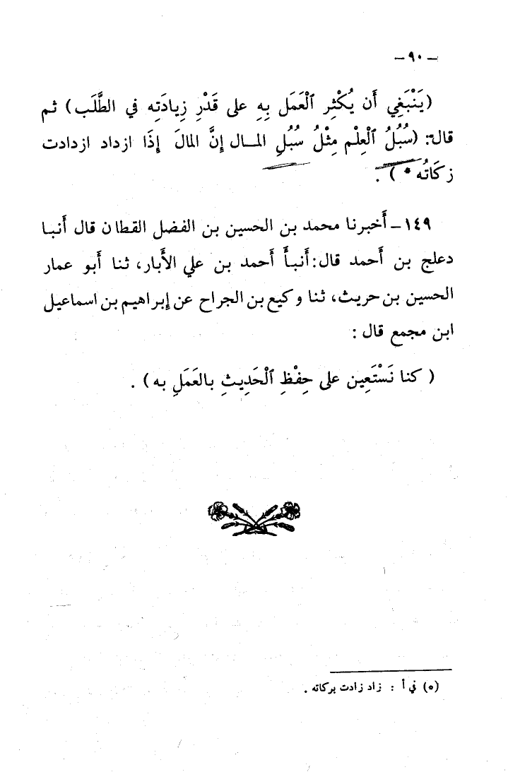 149 - أَخْبَرَنَا مُحَمَّدُ بْنُ الْحُسَيْنِ بْنِ الْفَضْلِ الْقَطَّانُ، قَالَ: أَنْبَأَ دَعْلَجُ بْنُ أَحْمَدَ، قَالَ أَنا أَحْمَدُ بْنُ عَلِيٍّ الْأَبَّارُ، ثنا أَبُو عَمَّارٍ الْحُسَيْنُ بْنُ حُرَيْثٍ، ثنا وَكِيعُ بْنُ الْجَرَّاحِ، عَنْ إِبْرَاهِيمَ بْنِ إِسْمَاعِيلَ بْنِ مُجَمِّعٍ، قَالَ: §«كُنَّا نَسْتَعِينُ عَلَى حِفْظِ الْحَدِيثِ بِالْعَمَلِ بِهِ»