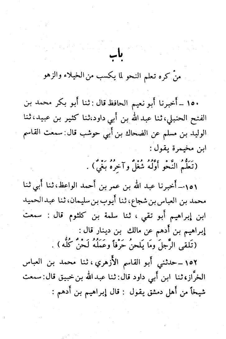 150 - أَخْبَرَنَا أَبُو نُعَيْمٍ الْحَافِظُ، قَالَ: ثنا أَبُو بَكْرٍ مُحَمَّدُ بْنُ الْفَتْحِ الْحَنْبَلِيُّ، ثنا عَبْدُ اللَّهِ بْنُ أَبِي دَاوُدَ، ثنا كَثِيرُ بْنُ عُبَيْدٍ، ثنا الْوَلِيدُ بْنُ مُسْلِمٍ، عَنِ الضَّحَّاكِ بْنِ أَبِي حَوْشَبٍ، قَالَ: سَمِعْتُ الْقَاسِمَ بْنَ مُخَيْمِرَةَ، يَقُولُ: §«تَعَلُّمُ النَّحْوِ أَوَّلُهُ شُغْلٌ وَآخِرُهُ بَغِيٌ»