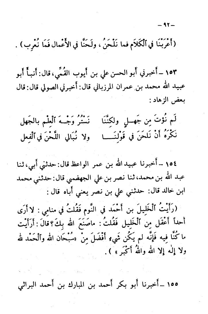 155 - أَخْبَرَنَا أَبُو بَكْرٍ أَحْمَدُ بْنُ الْمُبَارَكِ بْنِ أَحْمَدَ الْبَرَاثِيُّ -[93]-، ثنا عَلِيُّ بْنُ مُحَمَّدِ بْنِ مُوسَى التَّمَّارُ، بِالْبَصْرَةِ، ثنا أَبُو عِيسَى جُبَيْرُ بْنُ مُحَمَّدٍ، ثنا أَحْمَدُ بْنُ عَبْدِ اللَّهِ التِّرْمِذِيُّ، قَالَ: سَمِعْتُ نَصْرَ بْنَ عَلِيٍّ، يَقُولُ: سَمِعْتُ أَبِي، يَقُولُ: " §رَأَيْتُ الْخَلِيلَ بْنَ أَحْمَدَ فِي الْمَنَامِ فَقُلْتُ: لَهُ؟ مَا فَعَلَ بِكَ رَبُّكَ؟ قَالَ: غَفَرَ لِي، قُلْتُ: بِمَ نَجَوْتَ؟ قَالَ: بِلَا حَوْلَ وَلَا قُوَّةَ إِلَّا بِاللَّهِ الْعَلِيِّ الْعَظِيمِ، قُلْتُ: كَيْفَ وَجَدْتَ عِلْمَكَ أَعِنِّي الْعُرُوضَ، وَالْأَدَبَ، وَالشَّعَرَ؟ قَالَ: وَجَدْتُهُ هَبَاءً مَنْثُورًا "
