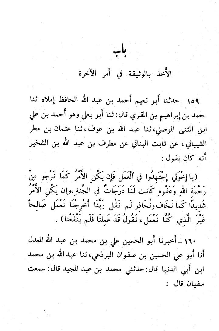 159 - حَدَّثنا أَبُو نُعَيْمٍ أَحْمَدُ بْنُ عَبْدِ اللَّهِ الْحَافِظُ، إِمْلَاءً، ثنا مُحَمَّدُ بْنُ إِبْرَاهِيمَ بْنِ الْمُقْرِئُ، قَالَ: ثنا أَبُو يَعْلَى وَهُوَ أَحْمَدُ بْنُ عَلِيِّ بْنِ الْمُثَنَّى الْمَوْصِلِيُّ، ثنا عَبْدُ اللَّهِ بْنُ عَوْنٍ، ثنا عُثْمَانُ بْنُ مَطَرٍ الشَّيْبَانِيُّ، عَنْ ثَابِتٍ الْبُنَانِيِّ، عَنْ مُطَرِّفِ بْنِ عَبْدِ اللَّهِ بْنِ الشِّخِّيرِ، أَنَّهُ كَانَ يَقُولُ: " يَا إِخْوَتِي §اجْتَهِدُوا فِي الْعَمَلِ فَإِنْ يَكُنِ الْأَمْرُ كَمَا نَرْجُو مِنْ رَحْمَةِ اللَّهِ وَعَفْوِهِ، كَانَتْ لَنَا دَرَجَاتٌ فِي الْجَنَّةِ، وَإِنْ يَكُنِ الْأَمْرُ شَدِيدًا كَمَا نَخَافُ وَنُحَاذِرُ لَمْ نَقُلْ: {رَبَّنَا أَخْرَجْنَا نَعْمَلْ صَالِحًا غَيْرَ الَّذِي كُنَّا نَعْمَلُ} [فاطر: 37] نَقُولُ: قَدْ عَمِلْنَا فَلَمْ يَنْفَعْنَا "