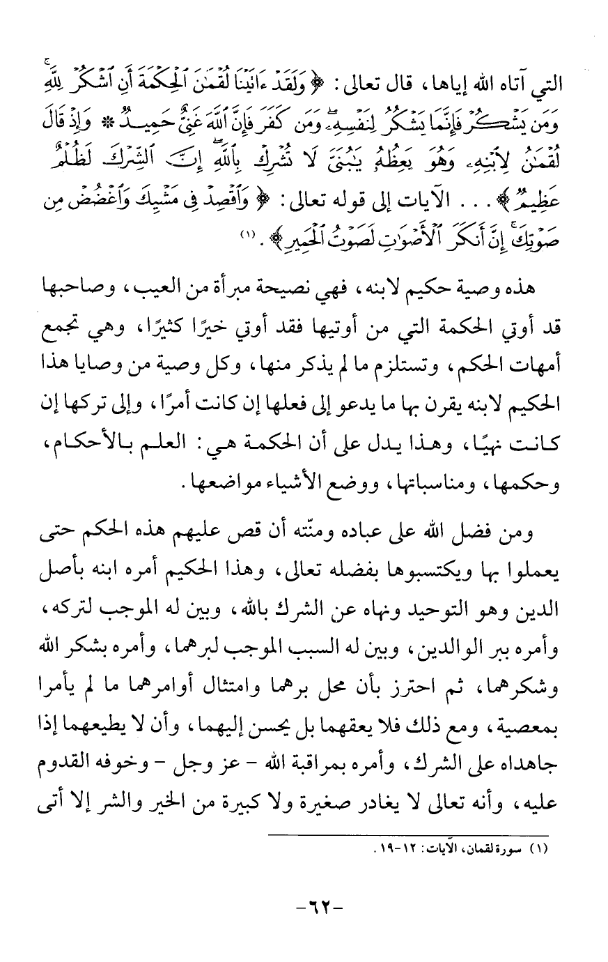 والداعية لا يكون حكيماً في دعوته ما لم يعمل بعلمه، ولهذا ينفر الناس عنه، وتزل موعظته من القلوب كما يزل القطر من الصفا؛ لأن الكلام - في الغالب - إذا خرج من القلب وقع في القلب، وإذا خرج من اللسان لم يتجاوز الآذان (¬1)، قال الشاعر: