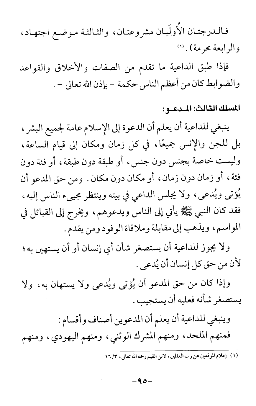 الوسيلة الثالثة: المحافظة على النظام المشروع: كحفظ الداعية تنظيم وقته وعدم إضاعته، وإذا كان الدعاة جماعة فعليهم أن يراعوا قواعد النظام التي أمر بها الإسلام، حتى تثمر جهودهم ولا تضيع؛ فإن القليل من العمل بنظامٍ والدوام عليه خير من الكثير مع الفوضى والانقطاع.