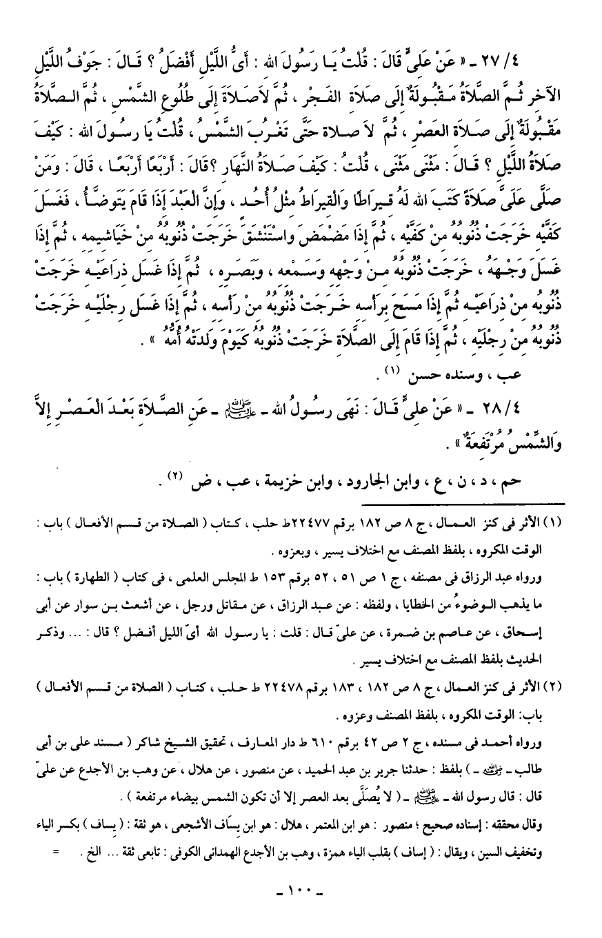 4/ 27 - " عَنْ عَلِىٍّ قَالَ: قُلتُ يَا رَسُولَ اللهِ: أَىّ اللَّيْلِ أفْضَلُ؟ قَالَ: جَوْفُ الليْلِ الآخِر ثُمَّ الصَّلاَةُ مَقْبُولَةٌ إِلَى صَلاَةِ الفَجْر، ثُمَّ لاَ صَلاَةَ إِلَى طُلُوع الشَّمْسِ، ثُمَّ الصَّلاَةُ مَقْبُولَةٌ إِلَى صَلاَةِ العَصْرِ، ثُمَّ لاَ صلاة حَتَّى تَغْرُبَ الشَّمْسُ، قُلتُ يَا رسُولَ الله: كَيْفَ صَلاَةُ اللَّيْلِ؟ قَالَ: مَثْنَى مَثْنَى، قُلتُ: كَيْفَ صَلاَةُ النَّهَارِ؟ قَالَ: أَرْبَعًا أَرْبَعًا، قَالَ: وَمَنْ صَلَّى عَلَىَّ صَلاَةً كتَبَ الله لَهُ قِيرَاطًا وَالقِيرَاطُ مِثْلُ أحُدٍ، وِإنَّ العَبْدَ إِذَا قَامَ يَتَوضأُ، فَغَسَلَ كَفَّيْهِ خَرَجَتْ ذُنُوُبهُ مِنْ كَفَّيْهِ، ثُمَّ إِذَا مَضْمَضَ واسْتَنْشَقَ خَرَجَتْ ذُنُوُبهُ مِنْ خَيَاشِيمِهِ، ثُمَّ إِذَا غَسَلَ وَجْهَهُ، خَرَجَتْ ذنُوبُهُ مِنْ وَجْهِهِ وَسَمْعِهِ، وَبَصَرِهِ، ثُمَّ إِذَا غَسَل ذِرَاعَيْهِ خَرَجَتْ ذُنُوبُه مِنْ ذِرَاعَيْهِ ثُمَّ إِذَا مَسَحَ بِرَأسِه خَرَجَتْ ذُنُوبُهُ مِنْ رَأسِهِ، ثُمَّ إذَا غَسَل رِجْلَيْهِ خَرَجَتْ ذنُوُبهُ مِنْ رِجْلَيْهِ، ثُمَّ إِذَا قَامَ إِلَى الصَّلاَةِ خَرَجَتْ ذُنُوبهُ كَيَوْمَ وَلدَتْهُ أُمُّهُ ".