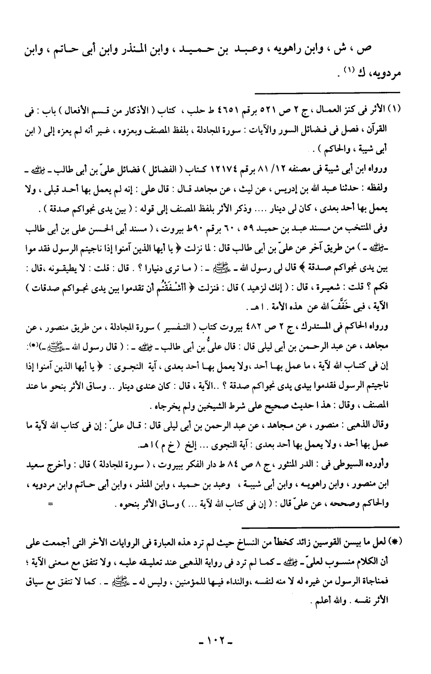 (*) لعل ما بين القوسين زائد كخطأ من النساخ حيث لم ترد هذه العبارة في الروايات الأخر التى أجمعت على أن الكلام منسوب لعلى - رضي الله عنه - كما لم ترد في رواية الذهبى عند تعليقه عليه، ولا تتفق مع معنى الآية؛ فمناجاة الرسول من غيره له لا منه لنفسه، والنداء فيها للمؤمنين، وليس له - صلى الله عليه وسلم -. كما لا تتفق مع سياق الأثر نفسه. والله أعلم.