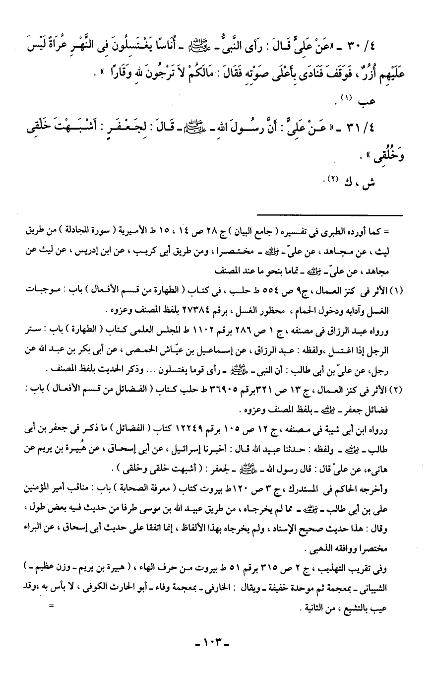 4/ 30 - "عَنْ عَلِىٍّ قَالَ: رَأى النَّبىُّ - صلى الله عليه وسلم - أنَاسًا يَغْتَسِلُونَ فِى النَّهْرِ عُرَاةً لَيْسَ عَلَيْهِم أُزُرٌ، فَوَقَفَ فَنَادَى بِأعْلَى صَوْتِهِ فَقَالَ: مَالَكُمْ لاَ تَرْجُونَ للهِ وَقَارًا ".