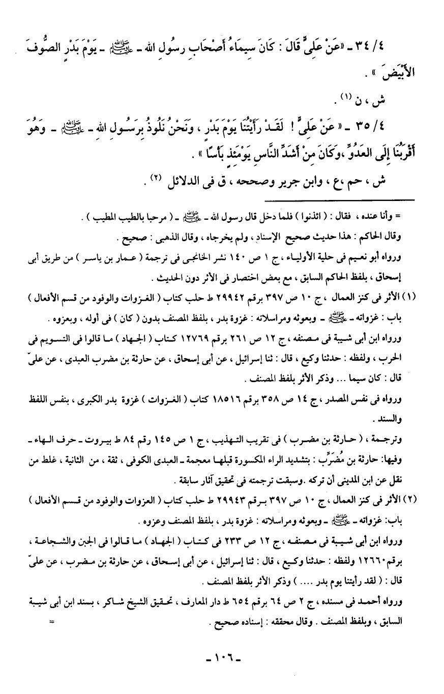 4/ 34 - "عَنْ عَلِىٍّ قَالَ: كَانَ سِيمَاءُ أصْحَابِ رسُولِ الله - صلى الله عليه وسلم - يَوْمَ بَدْرٍ الصُّوفَ الأبيَضَ ".