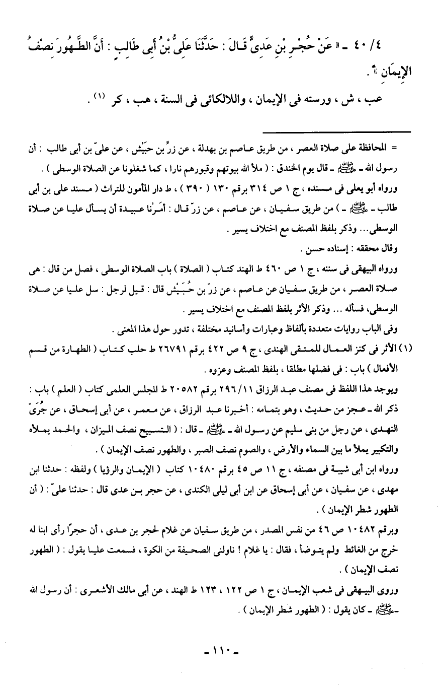 4/ 40 - "عَنْ حُجْرِ بْنِ عَدِىٍّ قَالَ: حَدَّثنَا عَلِىُّ بْنُ أبِى طَالِبٍ: أَنَّ الطَّهُورَ نِصْفُ الإِيمَانِ".