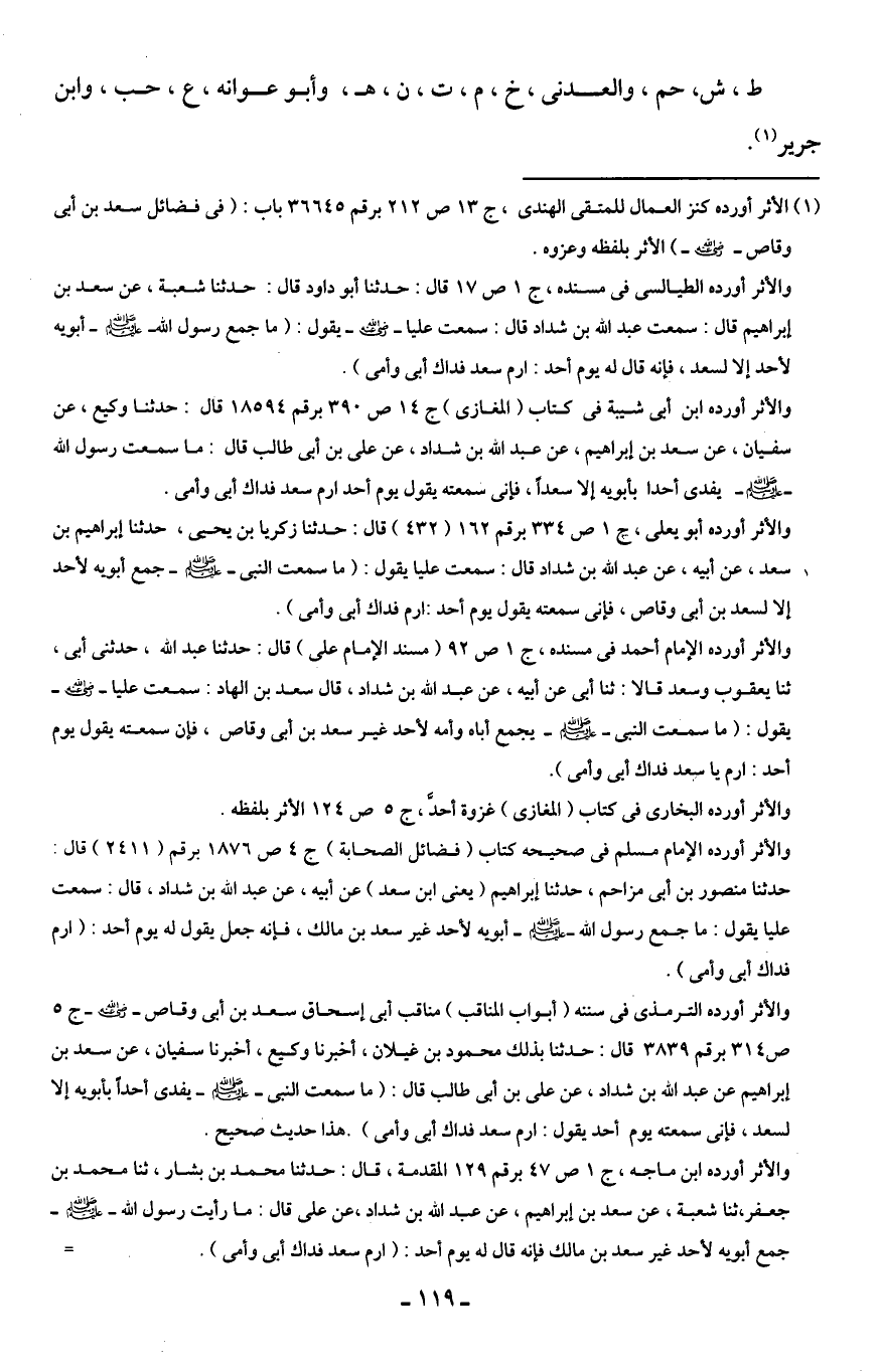 والأثر أورده ابن أبى شيبة في كتاب (المغازى) ج 14 ص 390 برقم 18594 قال: حدثنا وكيع، عن سفيان، عن سعد بن إبراهيم، عن عبد الله بن شداد، عن على بن أبى طالب قال: ما سمعت رسول الله - صلى الله عليه وسلم - يفدى أحدا بأبويه إلا سعدًا، فإنى سمعته يقول يوم أحد ارم سعد فداك أبى وأمى.
