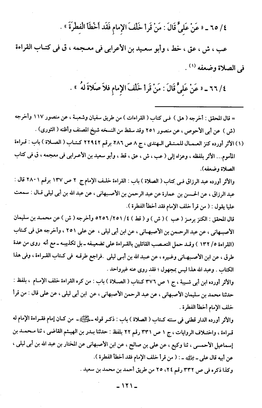 4/ 66 - "عَنْ عَلِىٍّ قَالَ: مَنْ قَرأ خَلفَ الإِمامِ فلا صلاةَ لهُ".