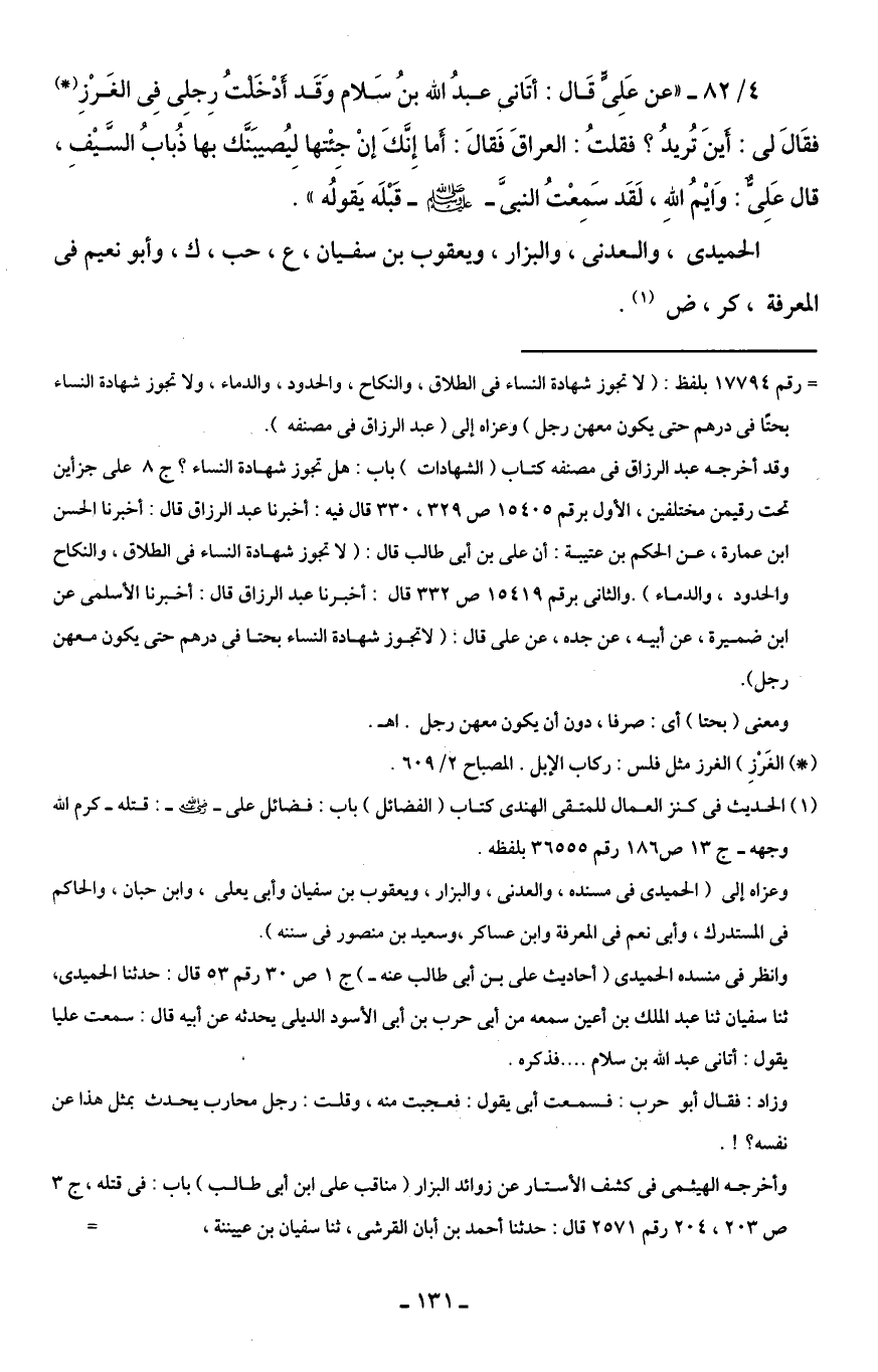 4/ 82 - "عن عَلِىٍّ قَال: أتَانى عبدُ الله بنُ سَلام وَقَد أَدْخَلتُ رِجلِى في الغَرْزِ (*) فقَالَ لى: أَينَ تُريدُ؟ فقلتُ: العراقَ فَقالَ: أَما إِنَّكَ إنْ جِئْتها لِيُصيبَنَّك بها ذُبابُ السَّيْفِ، قال عَلِىٌّ: وَايْمُ اللهِ، لَقَد سَمِعْتُ النبيَّ - صلى الله عليه وسلم - قَبْلَه يَقولُه".