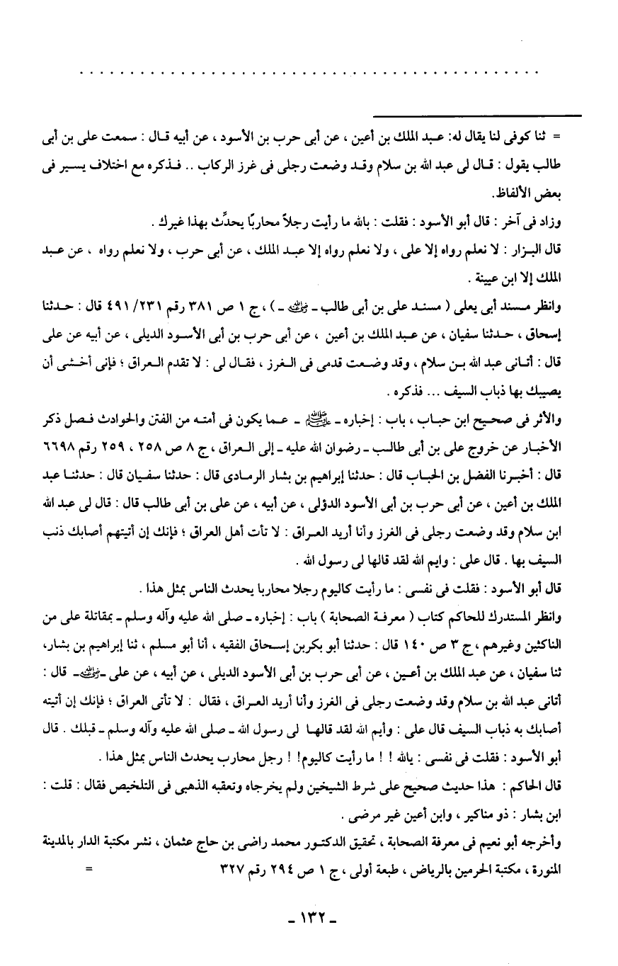 وانظر المستدرك للحاكم كتاب (معرفة الصحابة) باب: إخباره - صلى الله عليه وآله وسلم - بمقاتلة على من الناكثين وغيرهم، ج 3 ص 140 قال: حدثنا أبو بكر بن إسحاق الفقيه، أنا أبو مسلم، ثنا إبراهيم بن بشار، ثنا سفيان، عن عبد الملك بن أعين، عن أبى حرب بن أبى الأسود الديلى، عن أبيه، عن على - رضي الله عنه - قال: أتانى عبد الله بن سلام وقد وضعت رجلى في الفرز وأنا أريد العراق، فقال: لا تأتى العراق؛ فإنك إن أتيته أصابك به ذباب السيف قال على: وأيم الله لقد قالها لى رسول الله - صلى الله عليه وآله وسلم - قبلك. قال أبو الأسود: فقلت في نفسى: يالله! ! ما رأيت كاليوم! ! رجل محارب يحدث الناس بمثل هذا.