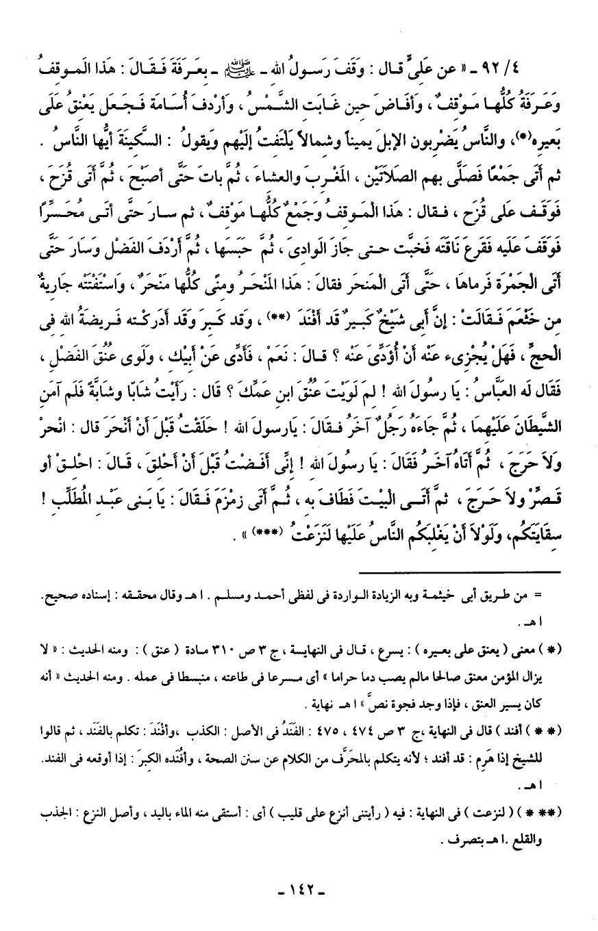 4/ 92 - " عن عَلِىٍّ قال: وَقَفَ رَسولُ اللهِ - صلى الله عليه وسلم - بِعَرَفَةَ فَقَالَ: هَذا المَوقِفُ وَعَرَفَةُ كُلُّها مَوْقِفٌ، وَأفَاضَ حين غَابَت الشَّمْسُ، وَأرْدفَ أُسَامَة فَجَعَل يَعْنقُ عَلَى بَعيرِه (*)، والنَّاسُ يَضْرِبون الإبلَ يمَينًا وشِمالًا يَلتَفِتُ إلَيْهم ويَقولُ: السَّكِينَةَ أيُّها النَّاسُ. ثم أتَى جَمْعًا فَصَلَّى بهم الصَلاَتَيْن، المَغْرِبَ والعشاءَ، ثُمَّ باتَ حَتَّى أصَبْحَ، ثُمَّ أَتَى قُزَحَ، فَوَقَف عَلى قُزَح، فقال: هَذا الْمَوقِفُ وَجَمعٌ كُلُّها مَوْقِفٌ، ثم سارَ حتَّى أتَى مُحَسِّرًا فَوَقَفَ عَلَيه فَقَرعَ نَاقَتَه فَخبَّت حتى جَازَ الَوادِىَ، ثُمَّ حَبَسَها، ثُمَّ أَرْدَفَ الفَضْل وَسَارَ حَتَّى أتَى الْجَمْرَة فَرماهَا، حَتَّى أتَى الْمَنحَر فقالَ: هَذا المَنْحَرُ ومِنًى كُلُّها مَنْحَرٌ، وَاسْتَفْتَتْه جَارِيةٌ مِن خَثْعَمَ فَقَالَتْ: إنَّ أَبِى شَيْخٌ كبيرٌ قَد أفْنَدَ (* *)، وَقد كَبِرَ وَقَد أَدَركْته فَريضَةُ اللهِ فِى الحجِّ، فَهَلْ يُجْزِئ عَنْه أَنْ أُؤَدِّى عَنْه؟ قالَ: نَعَمْ، فَأَدِّى عَنْ أَبِيْكِ، وَلَوى عُنُقَ الفَضْلِ، فَقَال لَه العَبَّاسُ: يَا رسُولَ اللهِ! لمَ لَوَيْتَ عُنُقَ ابنِ عَمَّكَ؟ قَال: رَأَيْتُ شَابّا وشَابَّةً فَلَم آمَنِ الشَّيطَانَ عَلَيْهِمَا، ثُمَّ جَاءَهُ رَجُلَ آخَرُ فقَالَ: يَارسولَ الله! حَلَقْتُ قَبْلَ أَنْ أَنْحَرَ قال: انْحرْ وَلاَ حَرَجَ، ثُمَّ أَتَاهُ آخَرُ فَقَالَ: يَا رسُولَ اللهِ! إِنِّى أَفَضْتُ قَبْلَ أَنْ أَحْلِقَ، قَالَ: احْلِقْ أو قَصِّرْ ولاَ حَرَجَ، ثمَ أتَى الْبيْتَ فَطَافَ بهِ، ثُمَّ أتَى زمْزَمَ فَقَالَ: يَا بَنى عَبْدِ المُطَلِّبِ! سِقَايَتَكُم، وَلَوْلاَ أنْ يَغْلِبَكُم النَّاسُ عَلَيْها لَنَزَعْتُ (* * *) ".