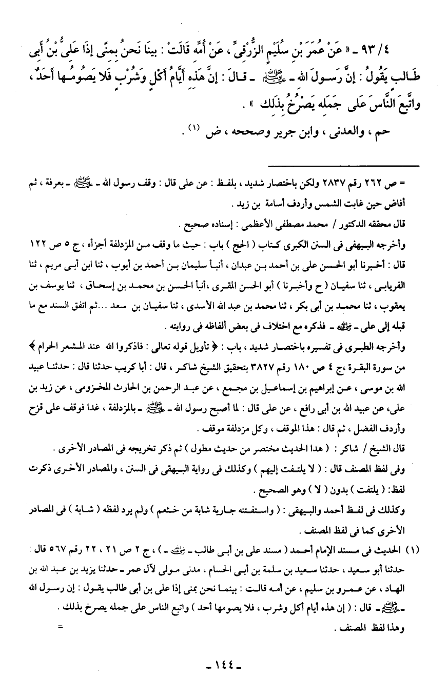 4/ 93 - " عَنْ عُمَرَ بْنِ سُلَيْمٍ الزُّرْقِىِّ، عَنْ أُمِّهِ قَالَتْ: بينَا نَحنُ بِمِنًى إذَا عَلِى بْنُ أَبِى طَالبٍ يَقُولُ: إنَّ رَسولَ اللهِ - صلى الله عليه وسلم - قالَ: إنَّ هَذِهِ أيامُ كْلٍ وَشُرْبٍ فَلا يَصُومُها أحَدٌ، واتَّبعَ النَّاسَ عَلى جَمَلِه يَصْرُخُ بِذَلِك ".
