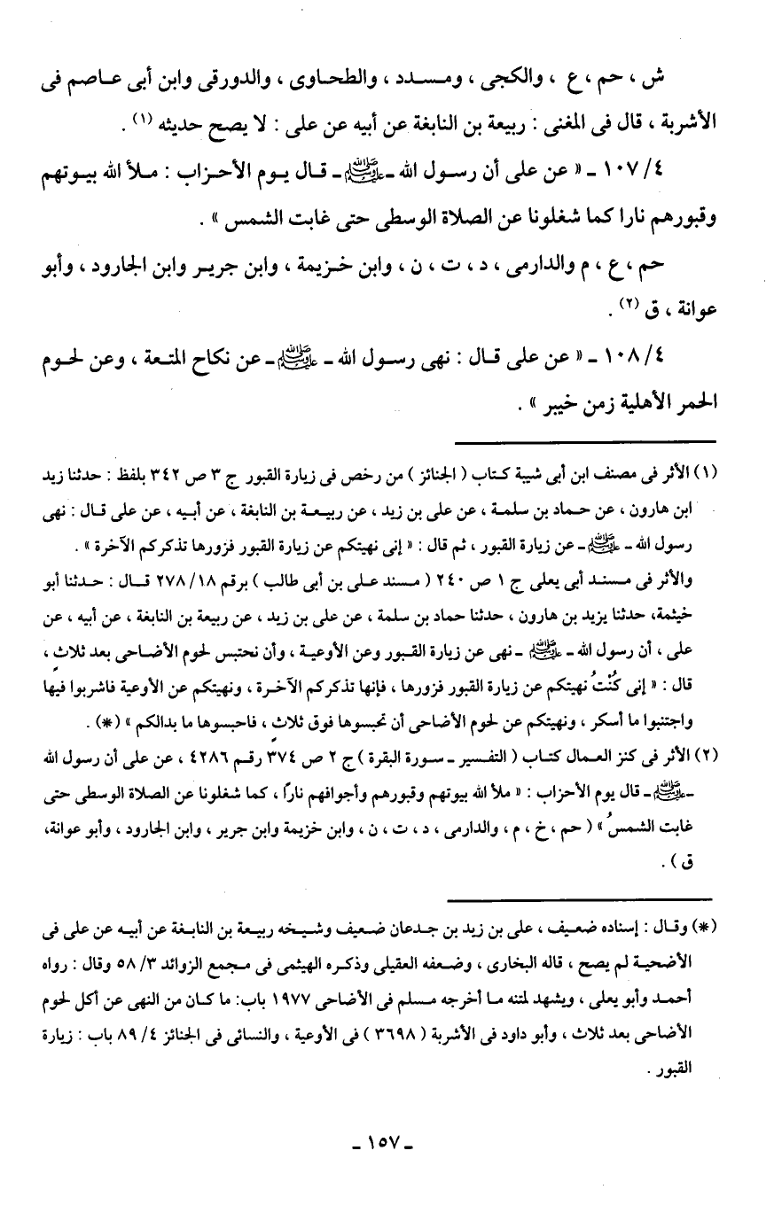 4/ 107 - " عن على أن رسول الله - صلى الله عليه وسلم - قال يوم الأحزاب: ملأ الله بيوتهم وقبورهم نارا كما شغلونا عن الصلاة الوسطى حتى غابت الشمس ".