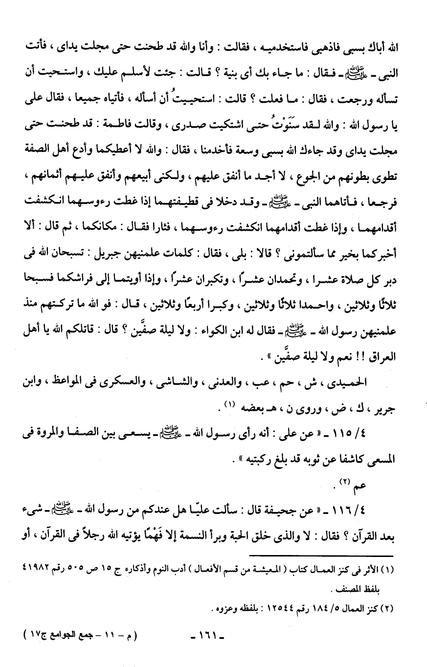 4/ 115 - " عن على: أنه رأى رسول الله - صلى الله عليه وسلم - يسعى بين الصفا والمروة في المسعى كاشفا عن ثوبه قد بلغ ركبتيه ".