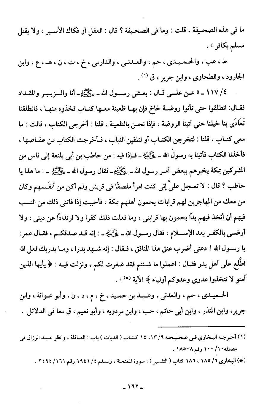 4/ 117 - " عن على قال: بعثنى رسول الله - صلى الله عليه وسلم - أنا والزبير والمقداد فقال: انطلقوا حتى تأتوا روضة خاخ فإن بها ظعينة معها كتاب فخذوه منها، فانطلقنا تَعَادَى بنا خيلنا حتى أتينا الروضة، فإذا نحن بالظعينة، قلنا: أخرجى الكتاب، قالت: ما معى كتاب، قلنا: لتخرجن الكتاب أو لتلقين الثياب، فأخرجت الكتاب من عقاصها، فأخذنا الكتاب فأتينا به رسول الله - صلى الله عليه وسلم - فإذا فيه: من حاطب بن أبى بلتعة إلى ناس من المشركين بمكة يخبرهم ببعض أمر رسول الله - صلى الله عليه وسلم - فقال رسول الله - صلى الله عليه وسلم -: ما هذا يا حاطب؟ قال: لا تعجل عليَّ إنى كنت امرًا ملصقًا في قريش ولم أكن من أنفَسهم وكان من معك من المهاجرين لهم قرابات يحمون أهلهم بمكة، فأحببت إذا فاتنى ذلك من النسب فيهم أن أتخذ فيهم يدًا يحمون بها قرابتى، وما فعلت ذلك كفرا ولا ارتدادًا عن دينى، ولا أرضى بالكفر بعد الإسلام، فقال رسول الله - صلى الله عليه وسلم -: إنه قد صدقكم، فقال عمر: يا رسول الله! دعنى أضرب عنق هذا المناقق، فقال: إنه شهد بدرا، وما يدريك لعل الله اطَّلع على أهل بدر فقال: اعملوا ما شئتم فقد غفرت لكم، ونزلت فيه: {يأيها الذين آمنو لا تتخذوا عدوى وعدوكم أولياء} الآية (*) ".