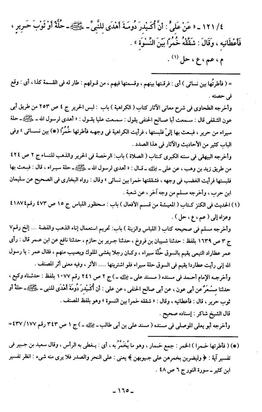 4/ 121 - " عَنْ عَلِىٍّ: أنَّ أُكَيْدِرَ دُومَةَ اهْدَى لِلنَّبِىِّ - صلى الله عليه وسلم - حُلَّةً أَوْ ثَوْبَ حَرِيرٍ، فَأَعْطَانيهِ، وَقَالَ: شَقِّقْهُ خُمُرًا بَيْنَ النِّسْوَةِ ".