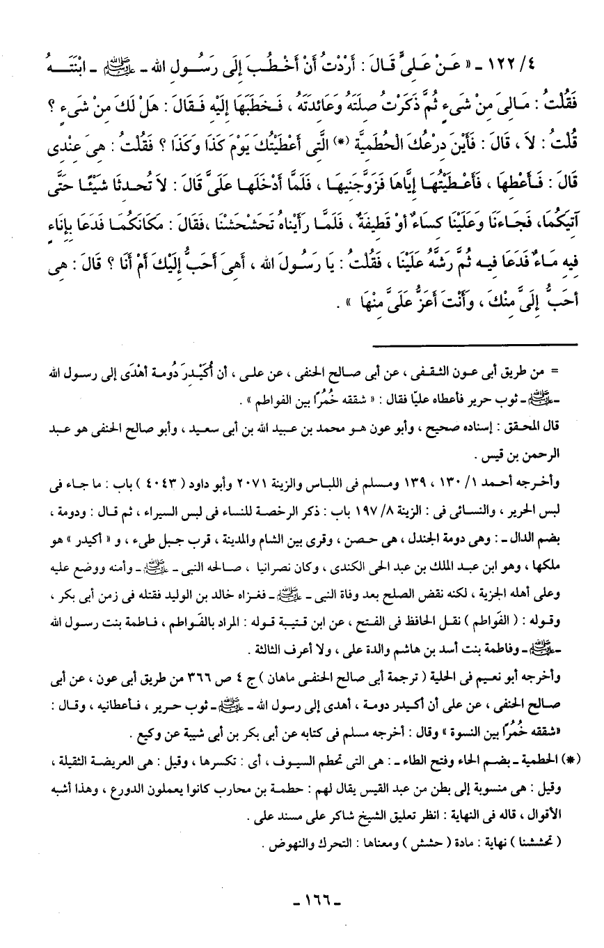 4/ 122 - " عَنْ عَلِىٍّ قَالَ: أَرْدْتُ أَنْ أَخْطُبَ إِلَى رَسُولِ الله - صلى الله عليه وسلم - ابْنَتَهُ فَقُلتُ: مَالِىَ مِنْ شَيءٍ ثُمَّ ذَكَرْتُ صِلَتَهُ وَعَائِدَتَهُ، فَخَطَبَهَا إِلَيْهِ فَقَالَ: هَلْ لَكَ مِنْ شَيءٍ؟ قُلتُ: لاَ، قَالَ: فَأَيْنَ دِرْعُكَ الْحُطَمِيَّة (*) الَّتِى أَعْطَيْتُكَ يَوْمَ كَذَاَ وَكَذَاَ؟ فَقُلْتُ: هِىَ عِنْدِى قَالَ: فَأَعْطِهَا، فَأَعْطَيْتُهَا إِيَّاهَا فَزَوَّجَنِيهَا، فَلَمَّا أَدْخَلَها عَلَىَّ قَالَ: لاَ تُحدِثَا شَيْئًا حَتَّى آتِيَكُمَا، فَجَاءَنَا وَعَلَيْنَا كِسَاءٌ أوْ قَطِيفَةٌ، فَلَمَّا رَأيْناهُ تَحَشْحَشْنَا، فَقَالَ: مَكَانَكُمَا فَدَعَا بِإِنَاءٍ فِيهِ مَاءٌ فَدَعَا فِيه ثُمَّ رَشَّهُ عَلَيْنَا، فَقُلتُ: يَا رَسُولَ الله، أَهِىَ أَحَبُّ إِلَيْكَ أمْ أَنَا؟ قَالَ: هِى أحَبُّ إِلَىَّ مِنْكَ، وَأنْتَ أعَزُّ عَلَىَّ مِنْهَا ".