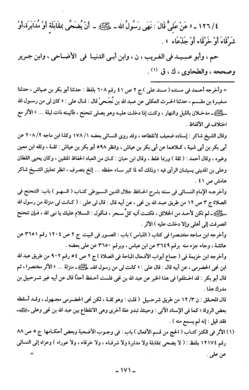 4/ 126 - " عَنْ عَلِىٍّ قَالَ: نَهَى رَسُولُ الله - صلى الله عليه وسلم - أن يُضَحَّى بمقَابَلَةٍ أَوْ مُدَابَرَة، أوْ شَرْقَاءَ أو خَرْقَاء أَوْ جَذْعَاء ".