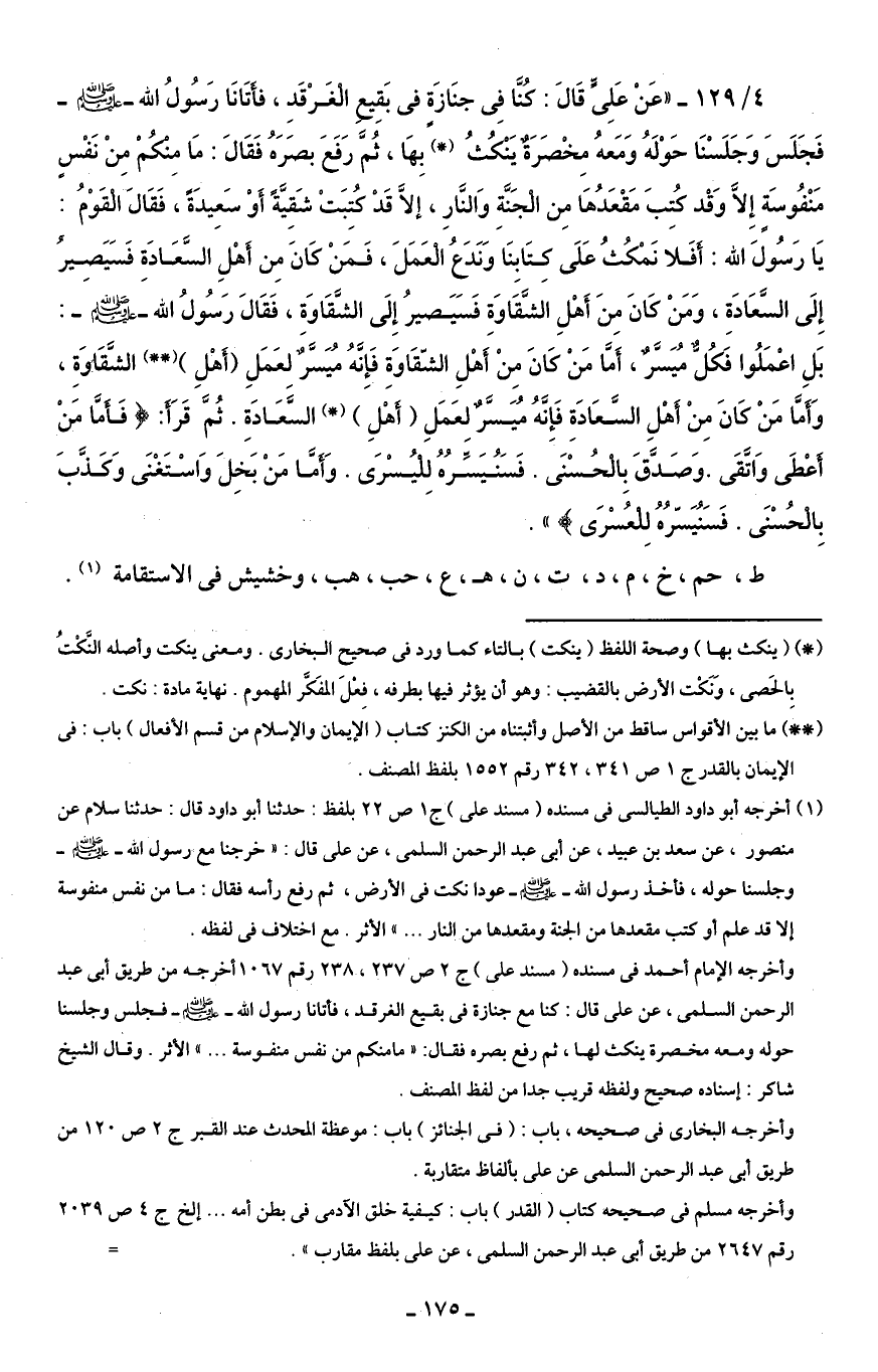 4/ 129 - "عَنْ عَلِيٍّ قَالَ: كُنَّا فِى جنَازَة في بَقِيع الغَرْقَدِ، فأتَانَا رَسُولُ الله - صلى الله عليه وسلم - فَجَلَسَ وَجَلَسْنَا حَوْلَهُ وَمَعهُ مِخْصَرَةٌ يَنْكُثُ (*) بِهَا، ثُمَّ رَفَعَ بصَرَهُ فَقَالَ: مَا مِنكمْ مِنْ نَفْسٍ مَنْفُوسَةٍ إِلاّ وَقْد كُتِبَ مَقْعَدُهَا مِن الجَنَّةِ وَالنَّارِ، إلاَّ قَدْ كُتِبَتْ شَقِيَّةً أوْ سَعِيدَةً، فَقَالَ القَوْمُ: يَا رَسُولَ الله: أَفَلا نَمْكُثُ عَلَى كتَابِنَا وَنَدَعُ العَمَلَ، فَمَنْ كَانَ مِن أهْلِ السَّعَادَةِ فَسَيَصِيرُ إِلَى السَّعَادَةِ، وَمَنْ كَانَ مِنَ أَهْلِ الشَّقَاوَةِ فَسَيَصيرُ إِلَى الشَّقَاوَةِ، فَقَالَ رَسُولُ الله - صلى الله عليه وسلم -: بَلِ اعْمَلُوا فَكُلٌّ مُيَسَّرٌ، أمَّا مَنْ كَانَ مِنْ أَهْلِ الشَّقَاوَةِ فَإِنَّهُ مُيَسَّرٌ لعَمَلِ (أهْلِ) (* *) الشَّقَاوَةِ، وَأَمَّا مَنْ كَانَ مِنْ أَهْلِ السَّعَادَةِ فَإنَّهُ مُيَسَّرٌ لعَمَلِ (أهْلِ) (*) السَّعَادَةِ. ثُمَّ قَرَأَ: {فَأَمَّا مَنْ أَعْطَى وَاتَّقَى (5) وَصَدَّقَ بِالْحُسْنَى (6) فَسَنُيَسِّرُهُ لِلْيُسْرَى (7) وَأَمَّا مَنْ بَخِلَ وَاسْتَغْنَى (8) وَكَذَّبَ بِالْحُسْنَى (9) فَسَنُيَسِّرُهُ لِلْعُسْرَى} ".